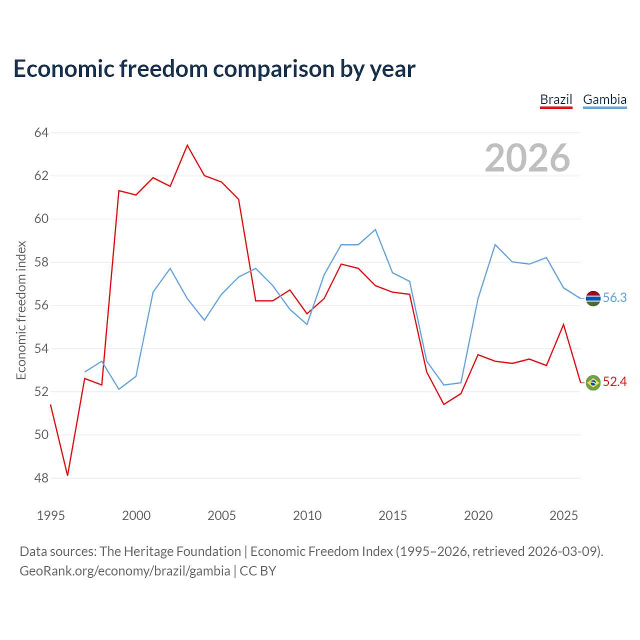 The Economic Freedom Index for Brazil is 52.4, ranking 148/197, compared to 56.3 for the Gambia, ranking 123/197. The chart above displays a comparison of annual changes in economic freedom indexes.