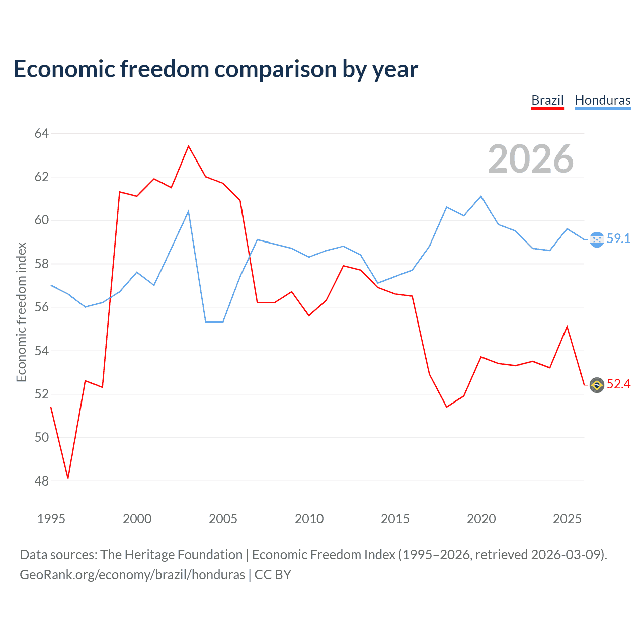 The Economic Freedom Index for Brazil is 52.4, ranking 148/197, compared to 59.1 for Honduras, ranking 105/197. The chart above displays a comparison of annual changes in economic freedom indexes.