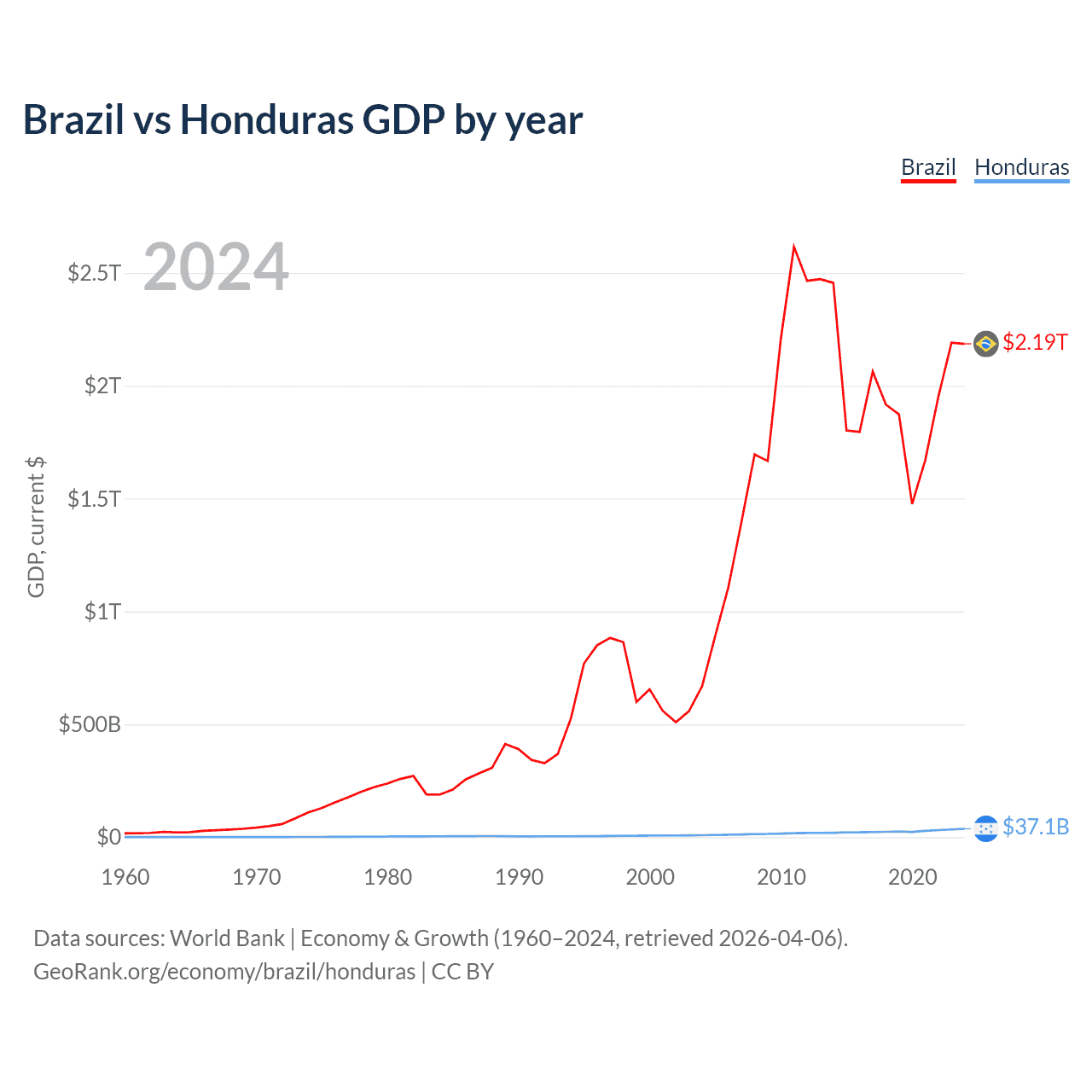 Brazil has a GDP of $2.19T compared to $37.1B for Honduras, ranking 10/197 and 104/197 by economy size, respectively.
