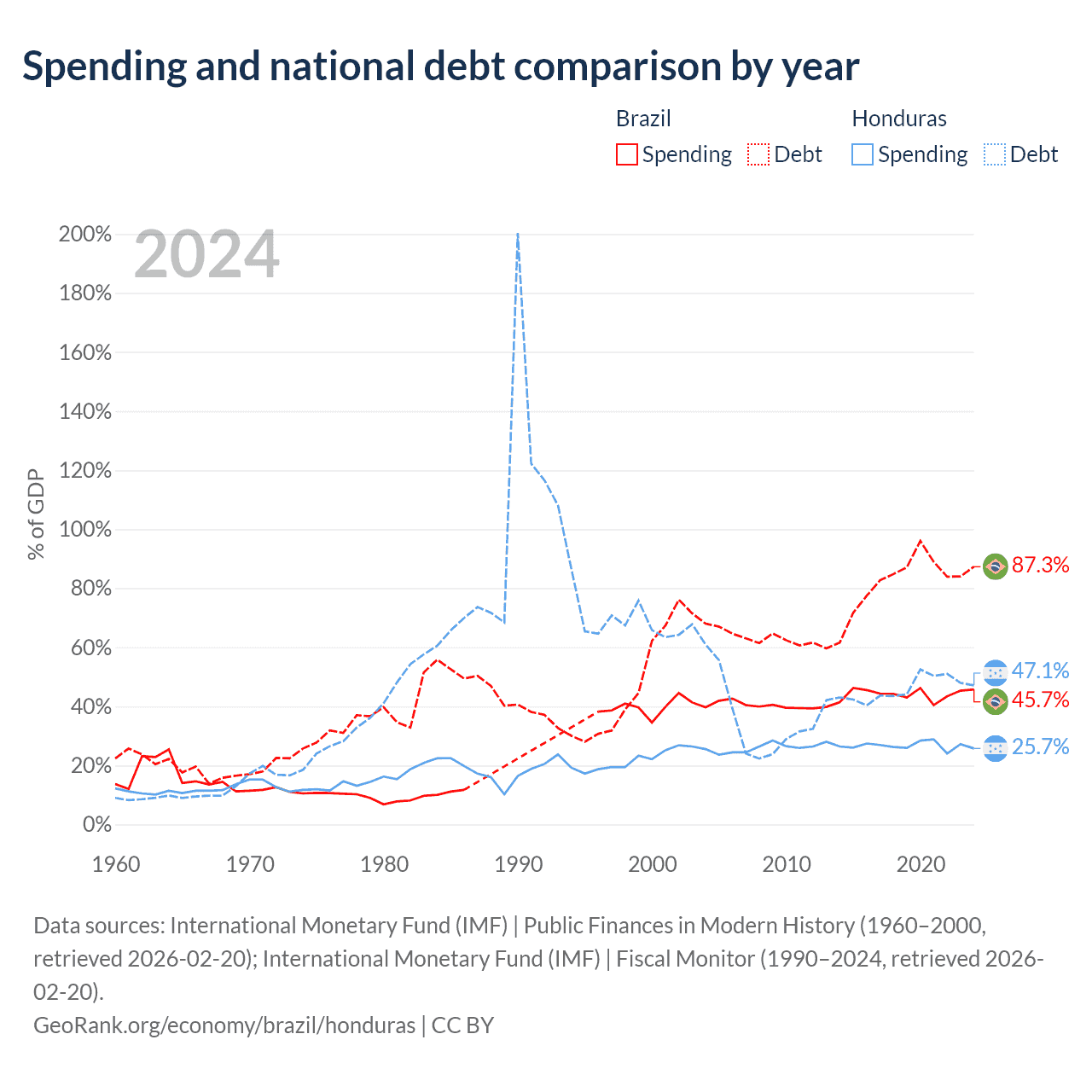 Brazil has $1.91T in government debt (87.3% of GDP), compared to $17.5B (47.1% of GDP) in Honduras.