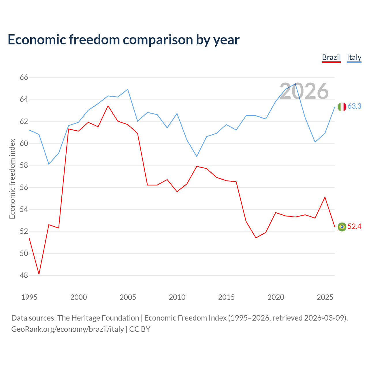The Economic Freedom Index for Brazil is 52.4, ranking 148/197, compared to 63.3 for Italy, ranking 80/197. The chart above displays a comparison of annual changes in economic freedom indexes.