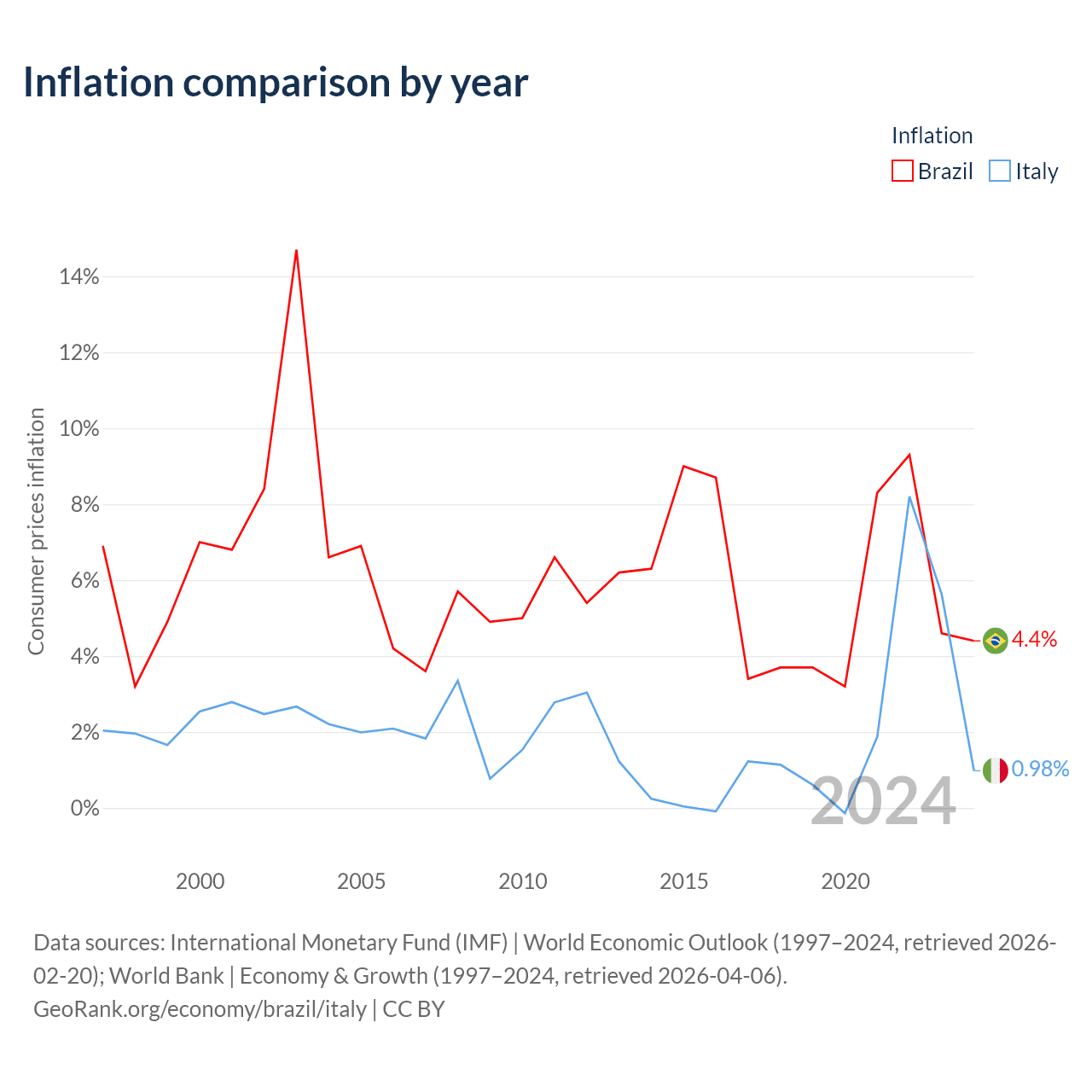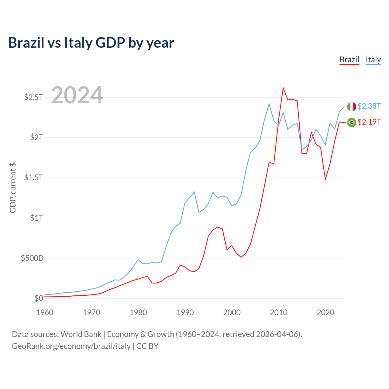 Brazil has a GDP of $2.19T compared to $2.38T for Italy, ranking 10/197 and 8/197 by economy size, respectively.