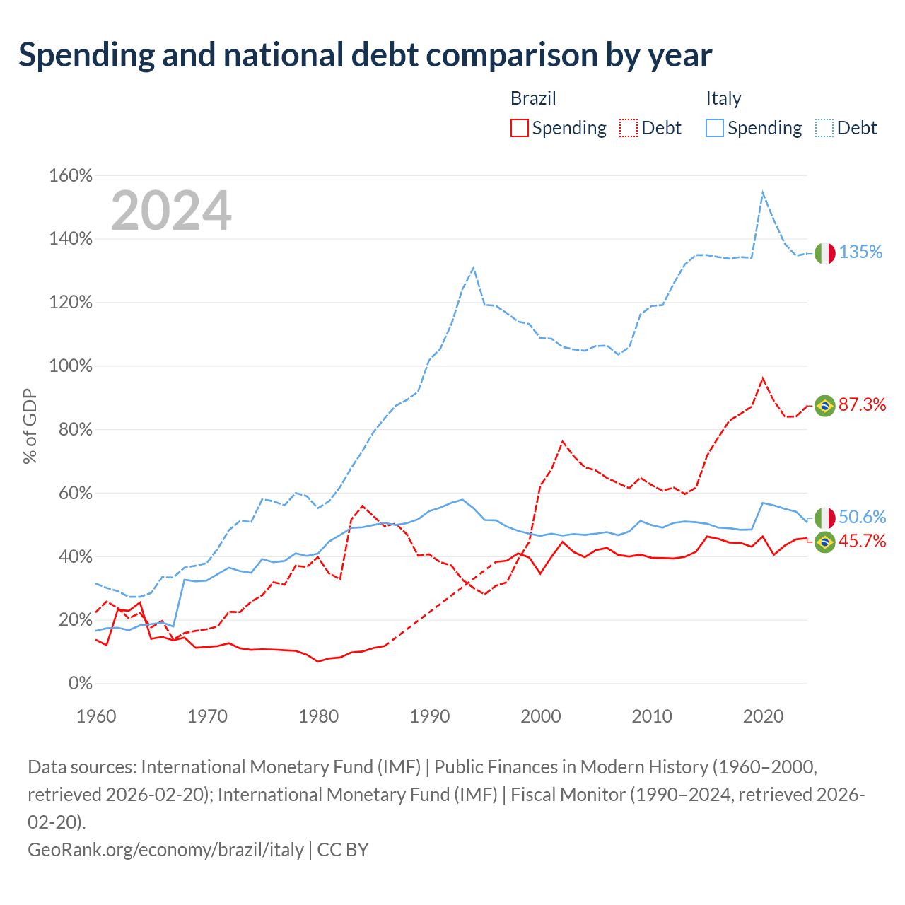 Brazil has $1.91T in government debt (87.3% of GDP), compared to $3.22T (135.3% of GDP) in Italy.
