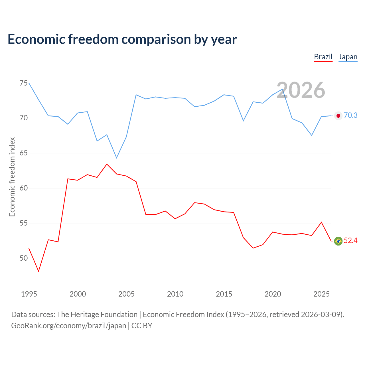 The Economic Freedom Index for Brazil is 52.4, ranking 148/197, compared to 70.3 for Japan, ranking 36/197. The chart above displays a comparison of annual changes in economic freedom indexes.