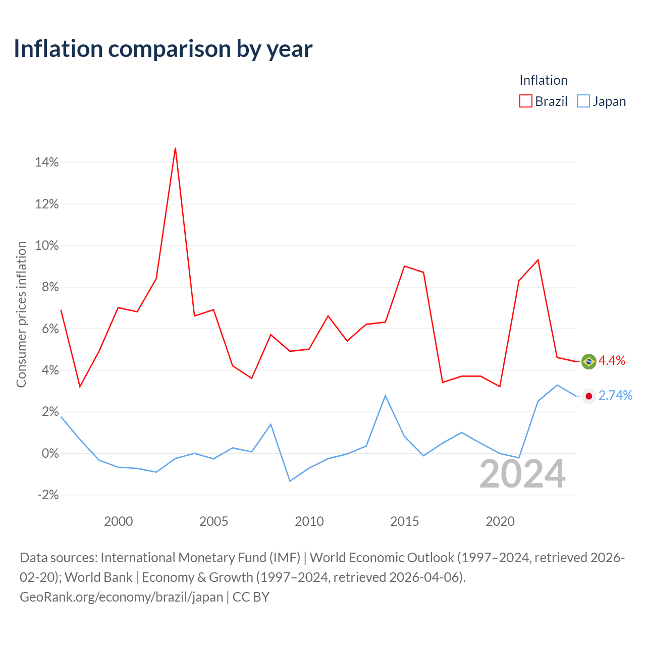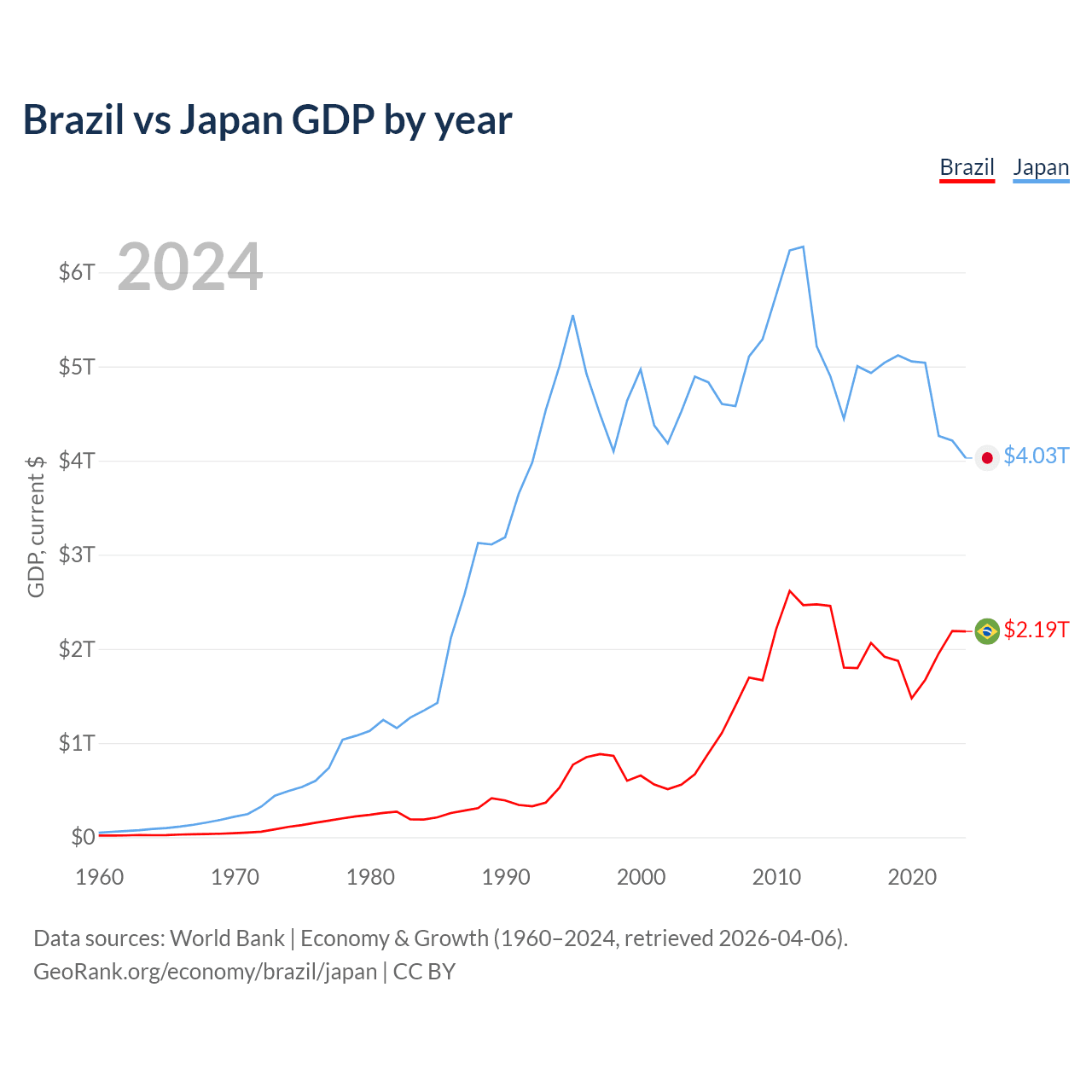Brazil has a GDP of $2.19T compared to $4.03T for Japan, ranking 10/197 and 4/197 by economy size, respectively.