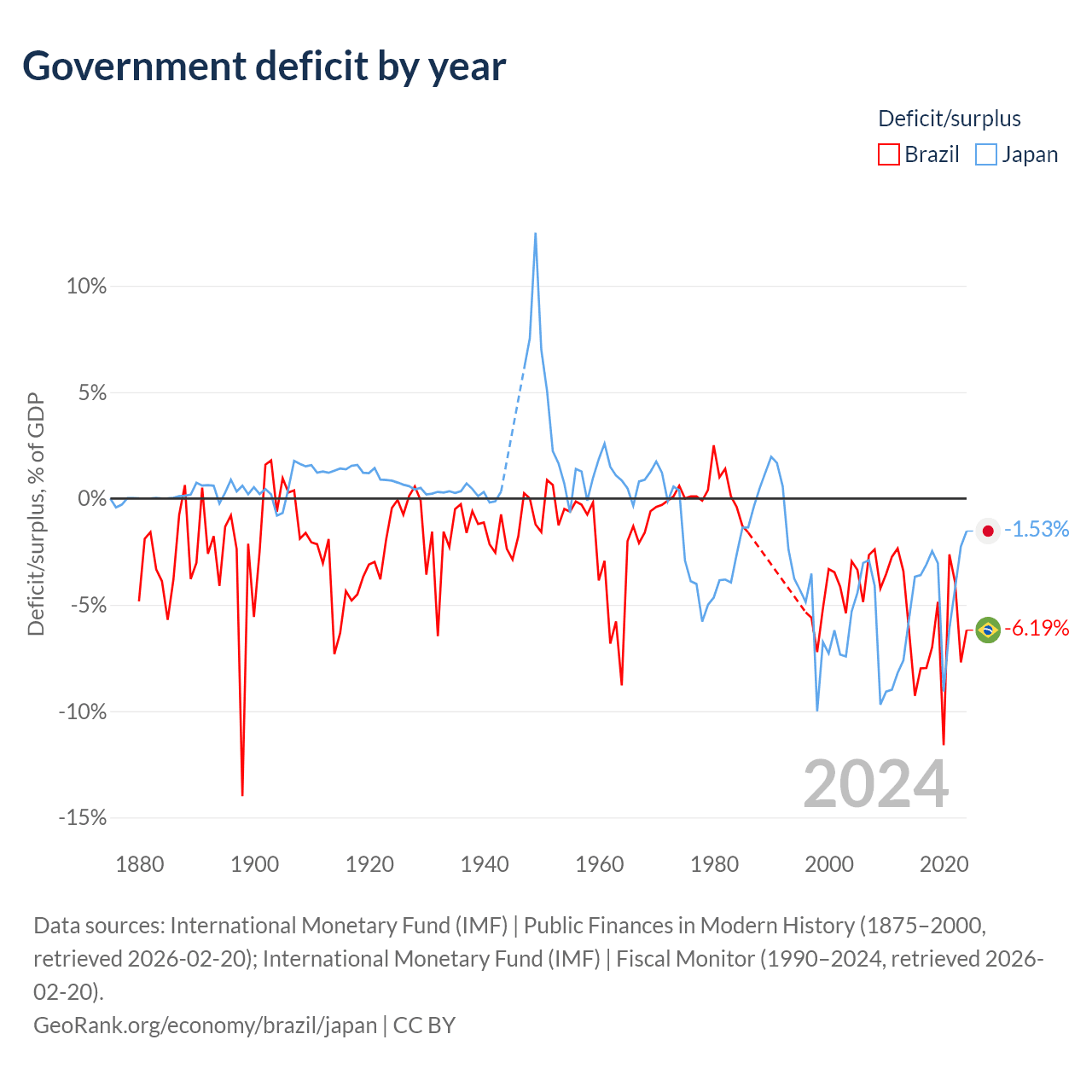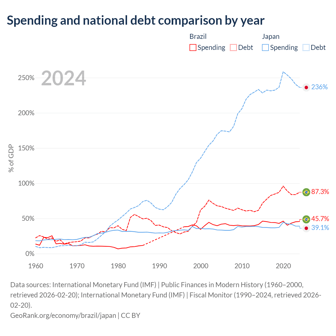 Brazil has $1.91T in government debt (87.3% of GDP), compared to $9.51T (236.1% of GDP) in Japan.
