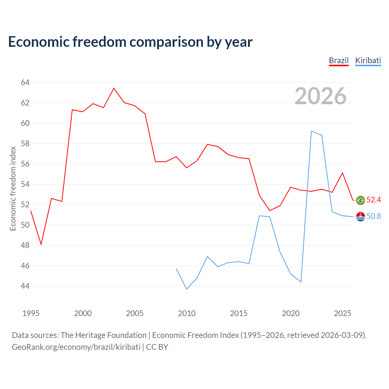 The Economic Freedom Index for Brazil is 52.4, ranking 148/197, compared to 50.8 for Kiribati, ranking 158/197. The chart above displays a comparison of annual changes in economic freedom indexes.
