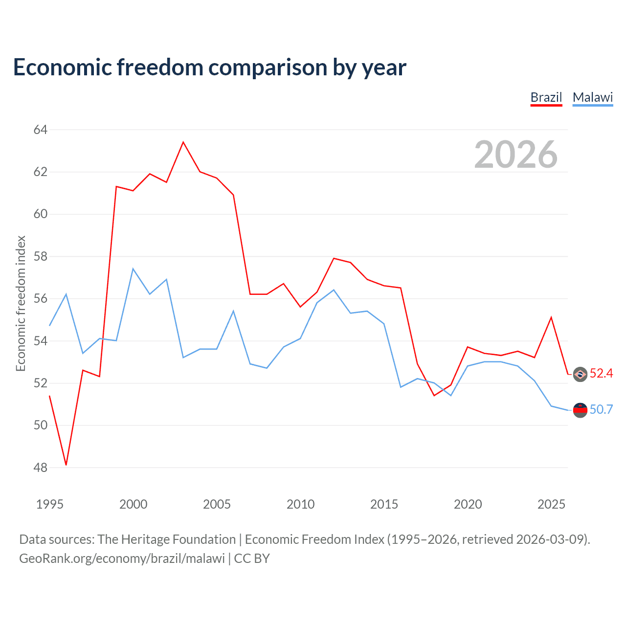 The Economic Freedom Index for Brazil is 52.4, ranking 148/197, compared to 50.7 for Malawi, ranking 159/197. The chart above displays a comparison of annual changes in economic freedom indexes.
