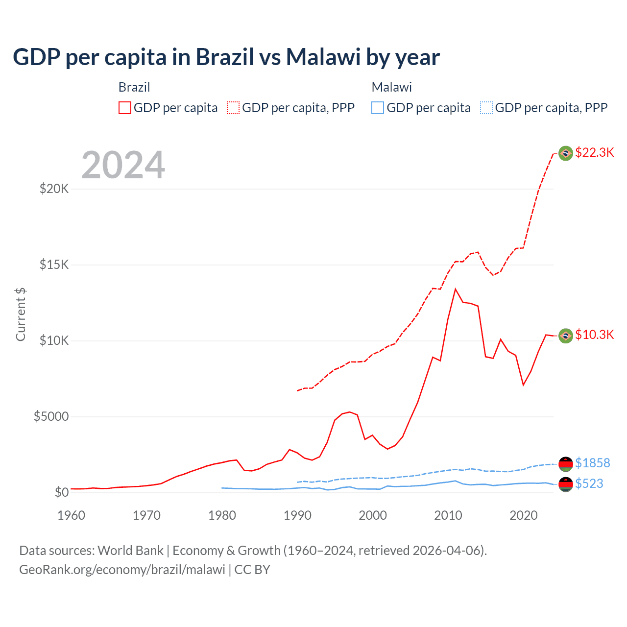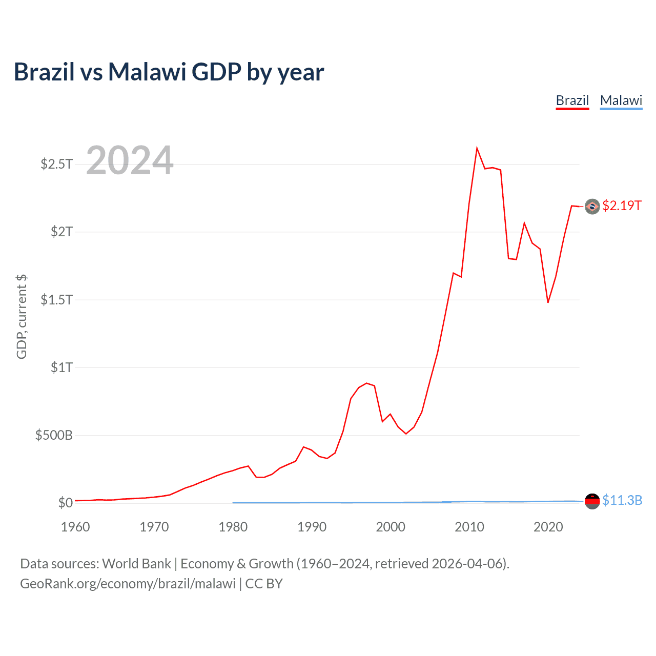 Brazil vs Malawi GDP by year