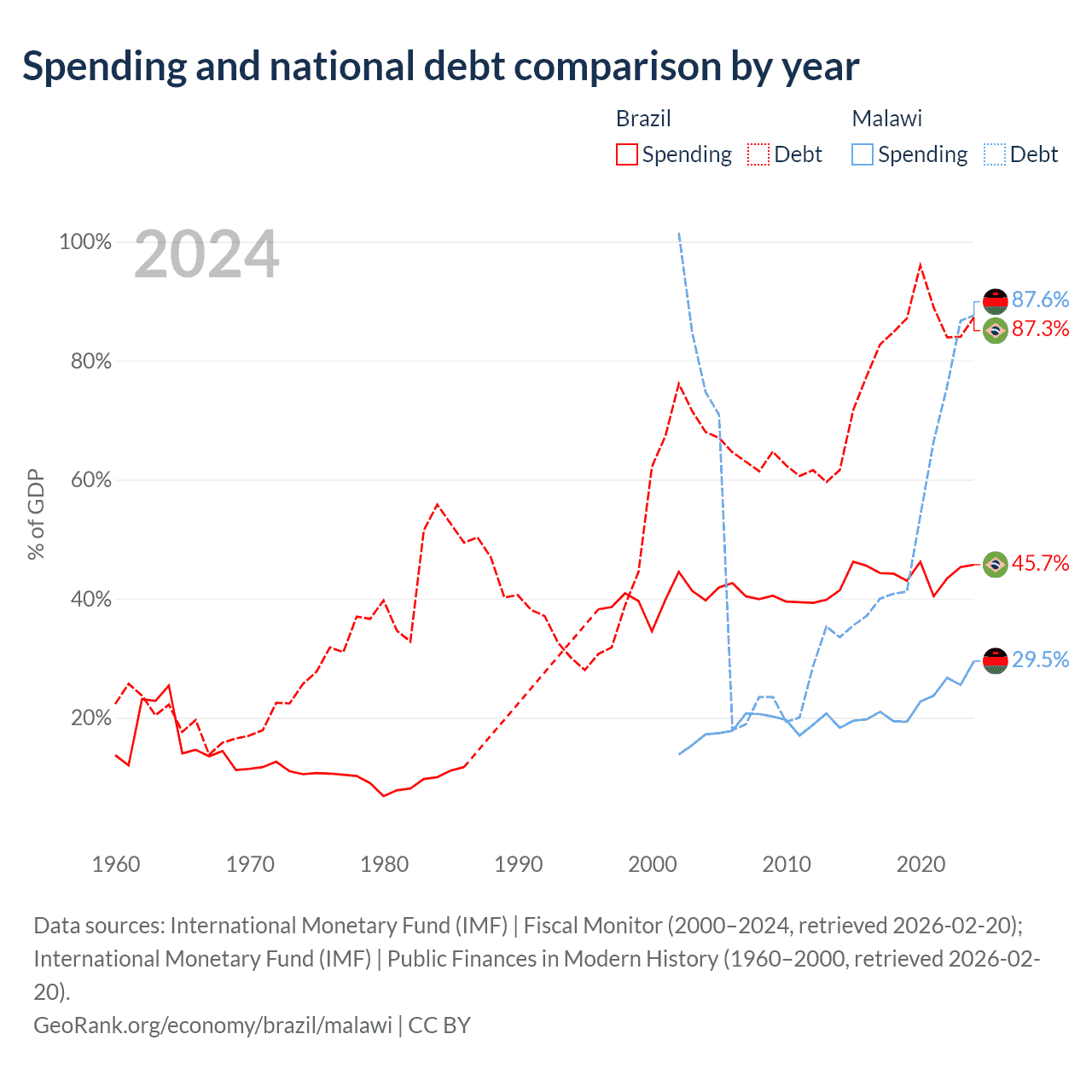 Brazil has $1.91T in government debt (87.3% of GDP), compared to $9.91B (87.6% of GDP) in Malawi.