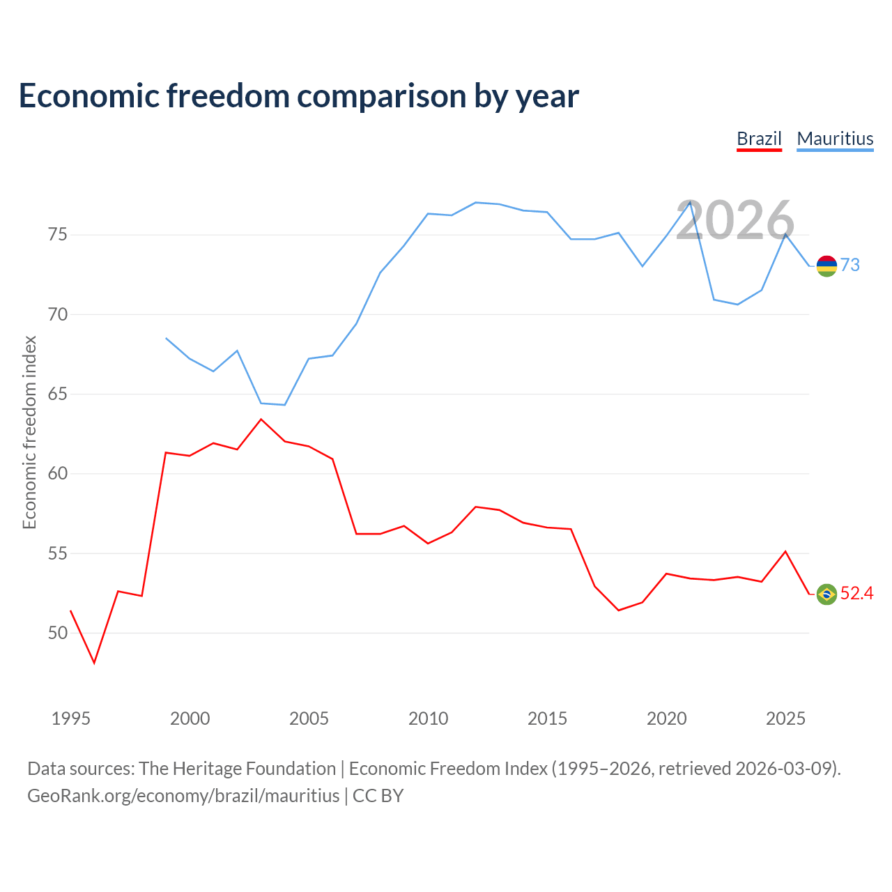 The Economic Freedom Index for Brazil is 52.4, ranking 148/197, compared to 73 for Mauritius, ranking 26/197. The chart above displays a comparison of annual changes in economic freedom indexes.
