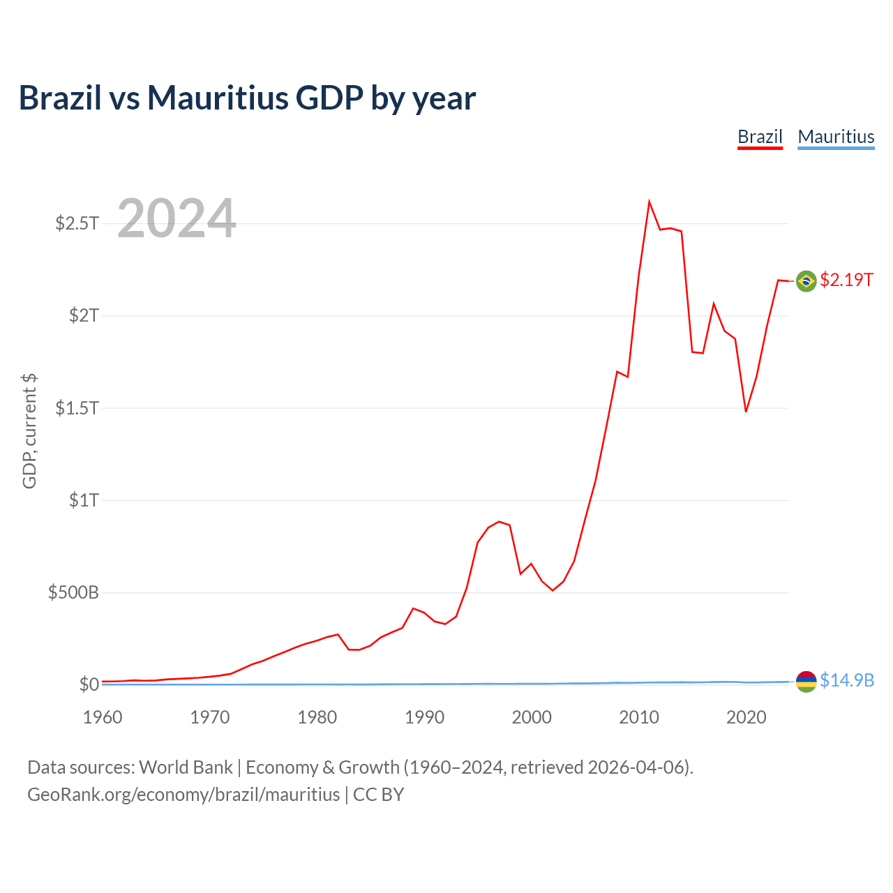 Brazil has a GDP of $2.19T compared to $14.9B for Mauritius, ranking 10/197 and 143/197 by economy size, respectively.