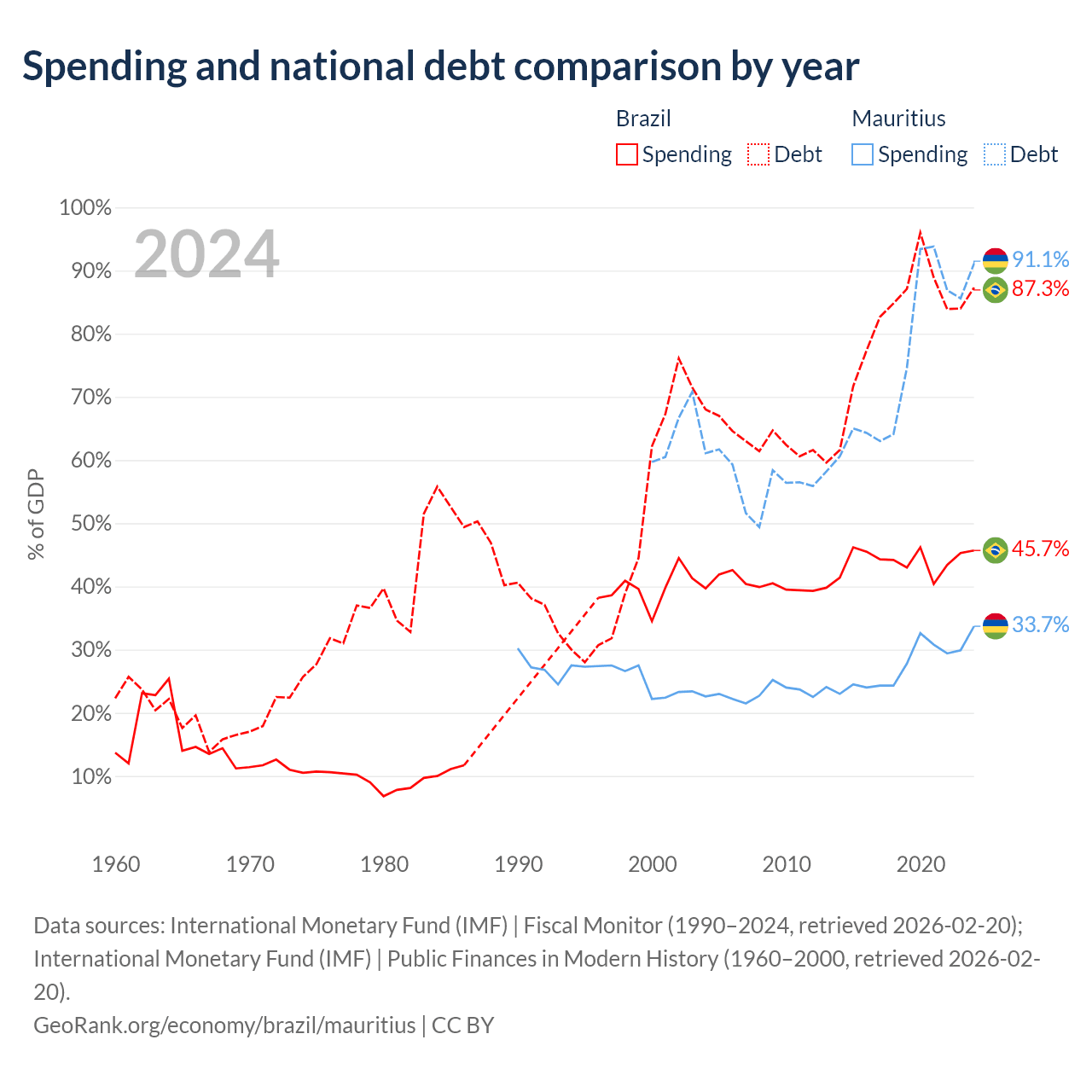 Brazil has $1.91T in government debt (87.3% of GDP), compared to $13.6B (91.1% of GDP) in Mauritius.