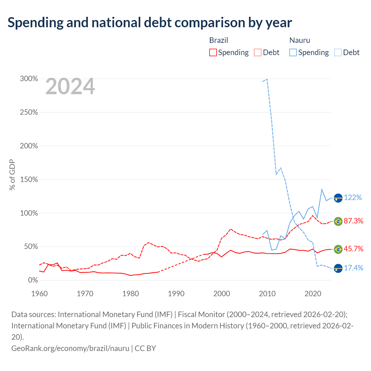 Brazil has $1.91T in government debt (87.3% of GDP), compared to $28.3M (17.4% of GDP) in Nauru.