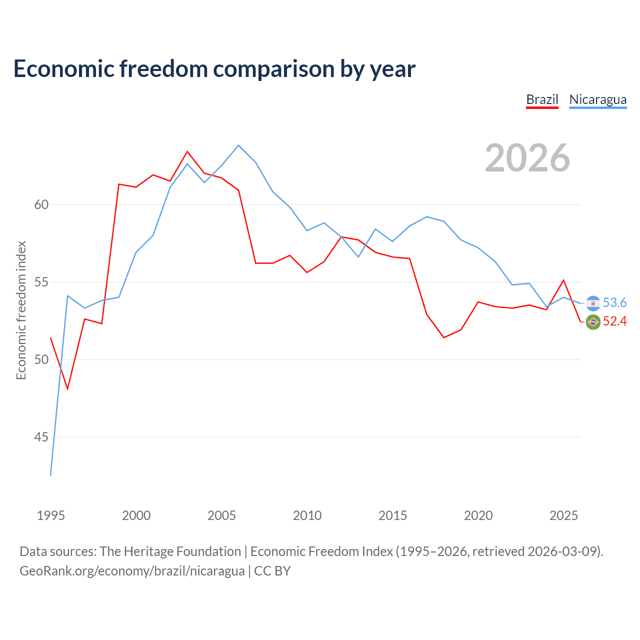 Data sources: The Heritage Foundation | Economic Freedom Index (1995–2026, retrieved 2026-03-09).