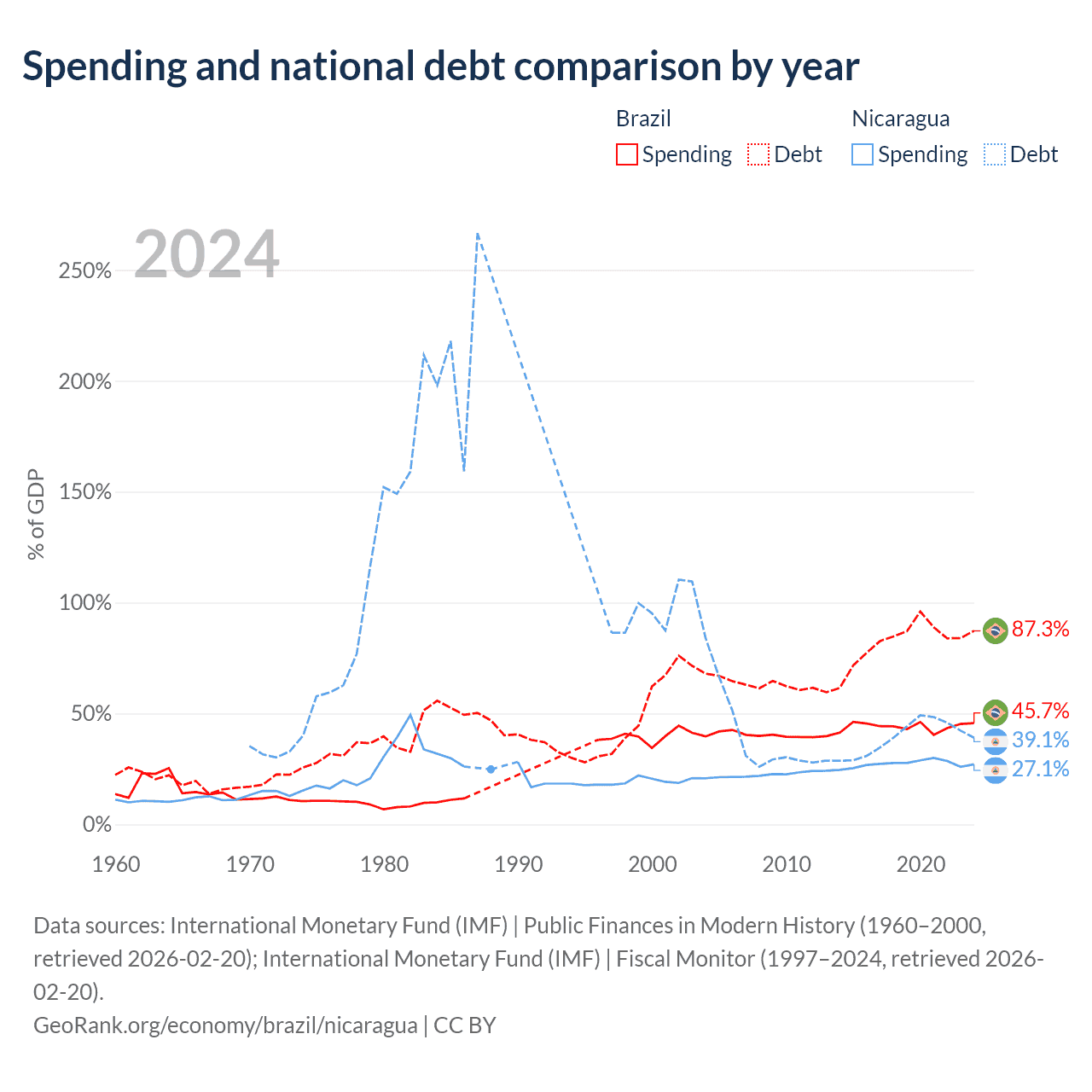 Brazil has $1.91T in government debt (87.3% of GDP), compared to $7.71B (39.1% of GDP) in Nicaragua.