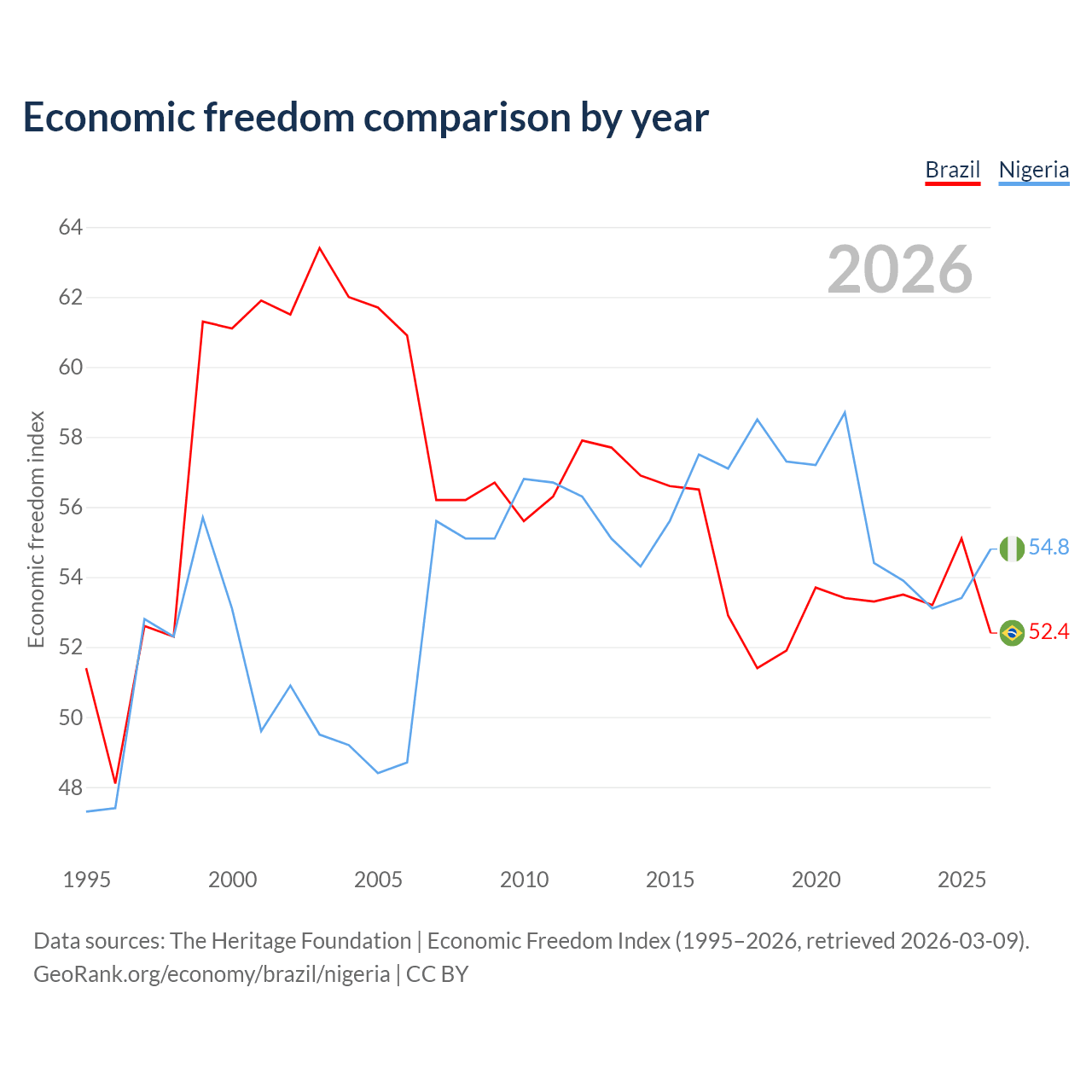 The Economic Freedom Index for Brazil is 52.4, ranking 148/197, compared to 54.8 for Nigeria, ranking 132/197. The chart above displays a comparison of annual changes in economic freedom indexes.