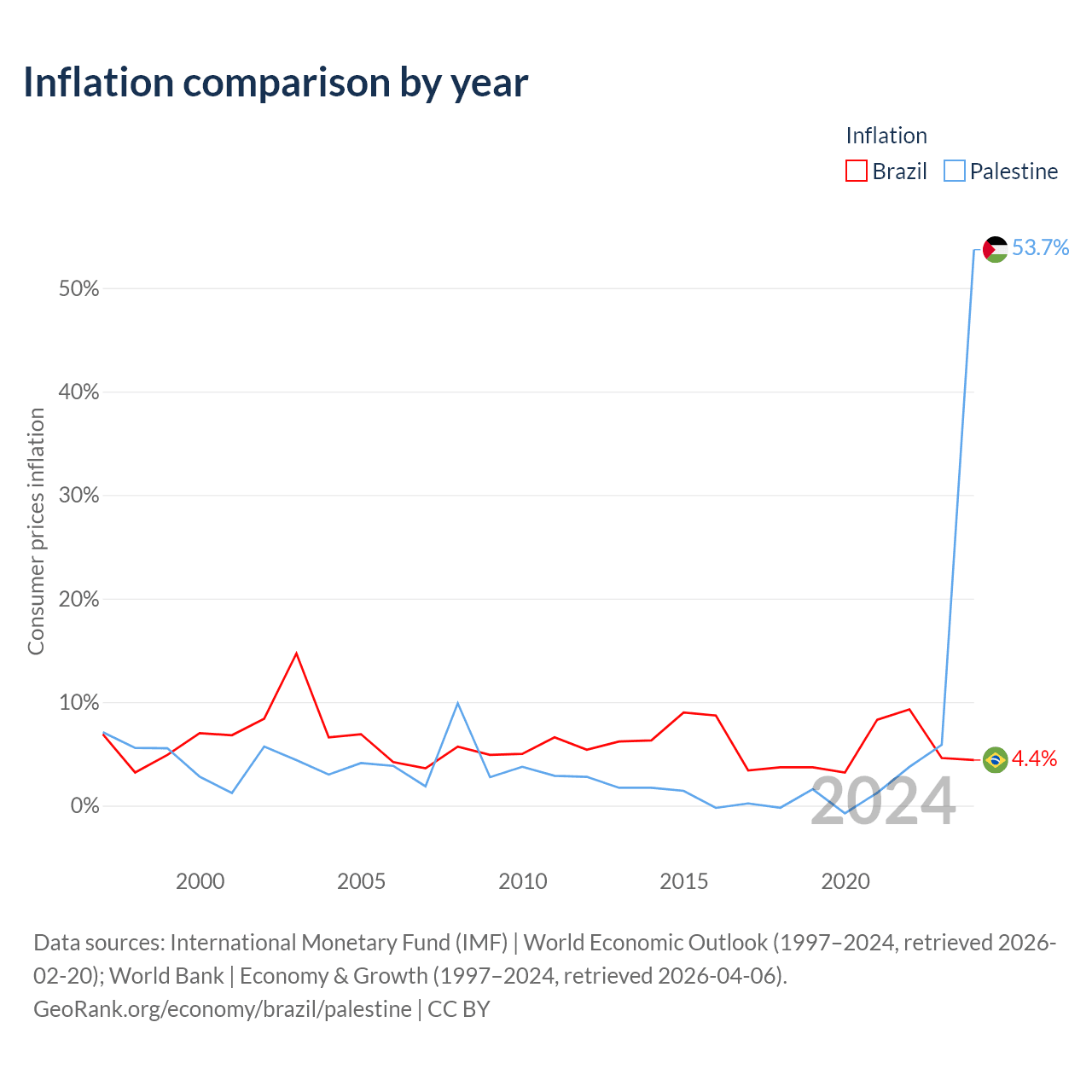 Brazil has a GDP of $2.19T compared to $13.7B for Palestine, ranking 10/197 and 146/197 by economy size, respectively.