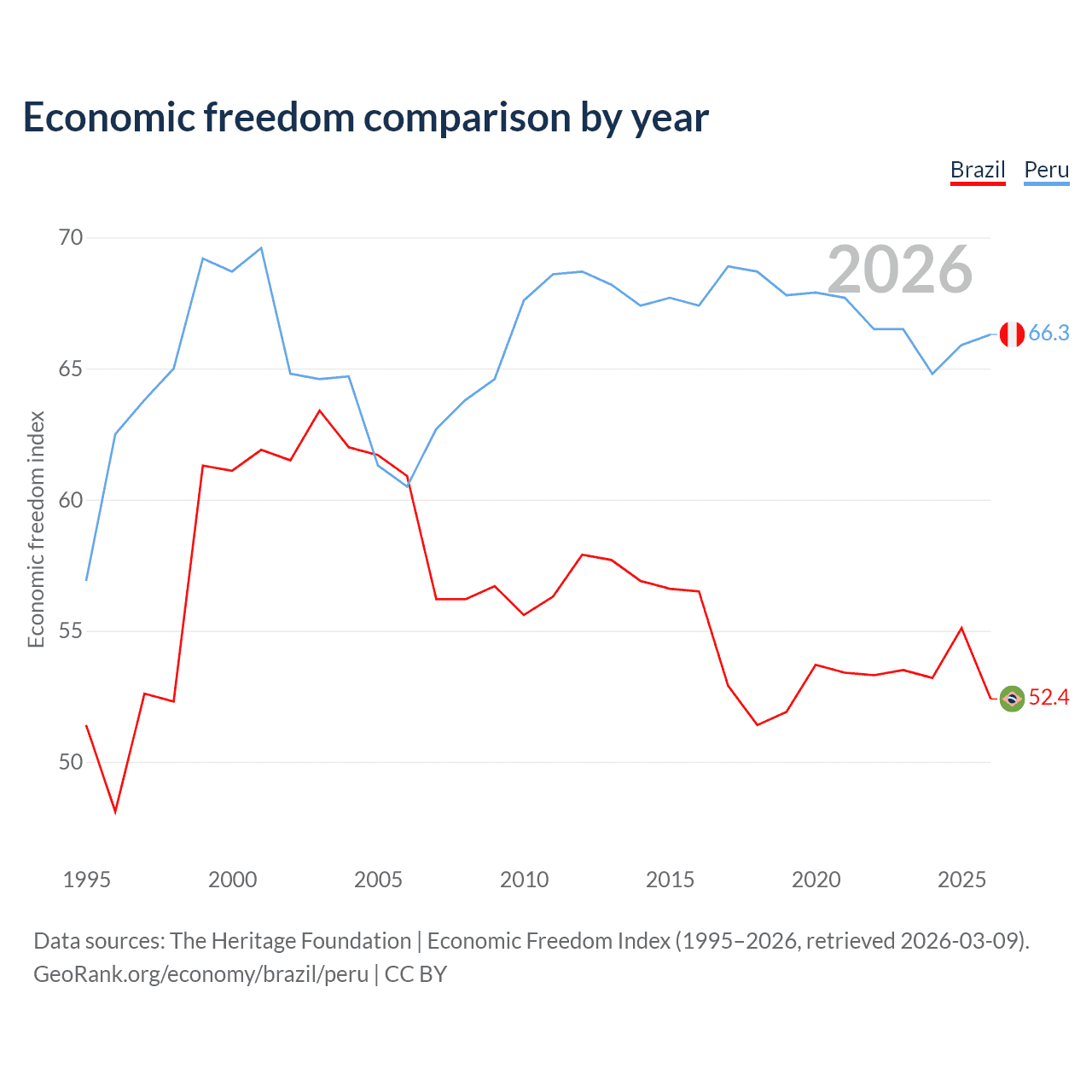 The Economic Freedom Index for Brazil is 52.4, ranking 148/197, compared to 66.3 for Peru, ranking 62/197. The chart above displays a comparison of annual changes in economic freedom indexes.
