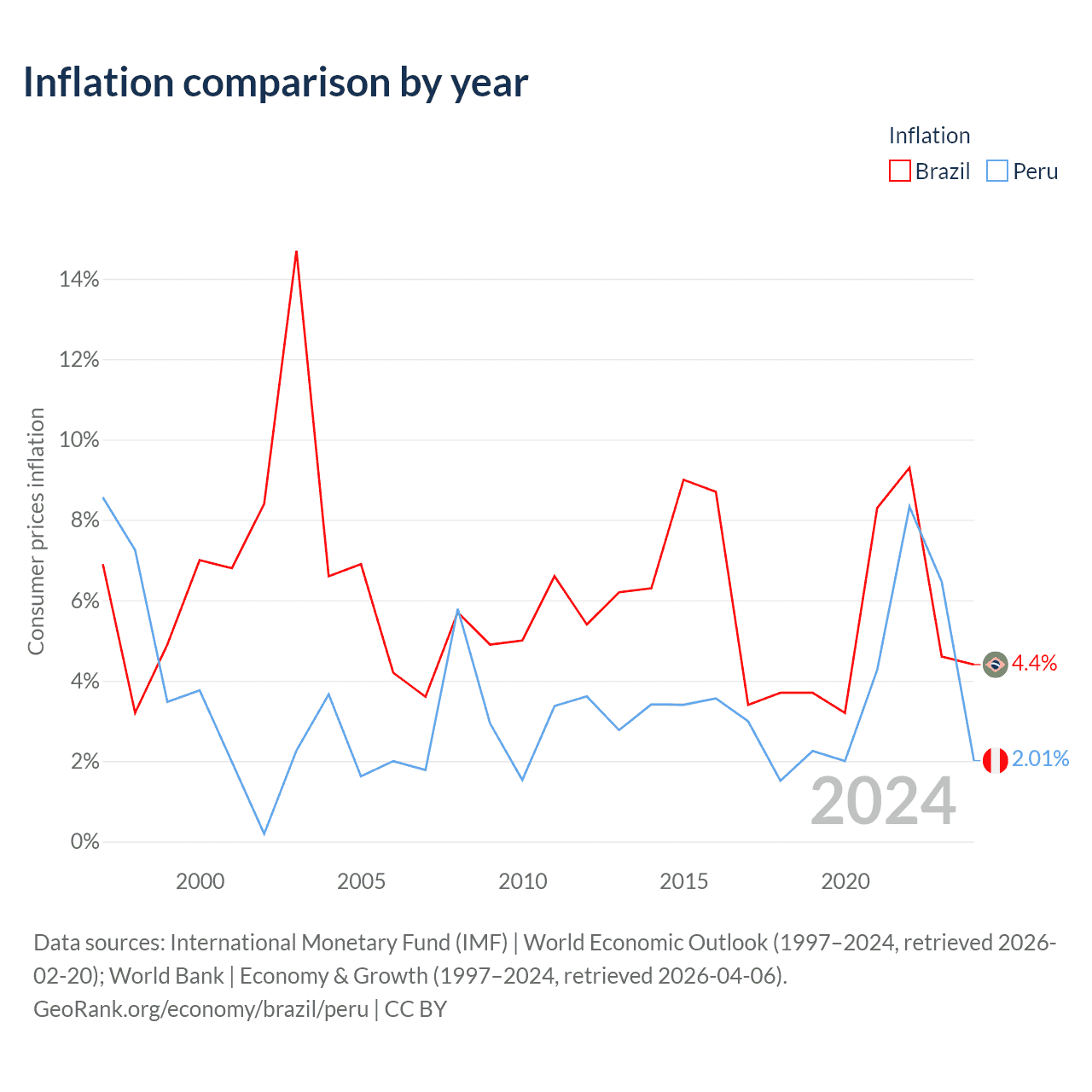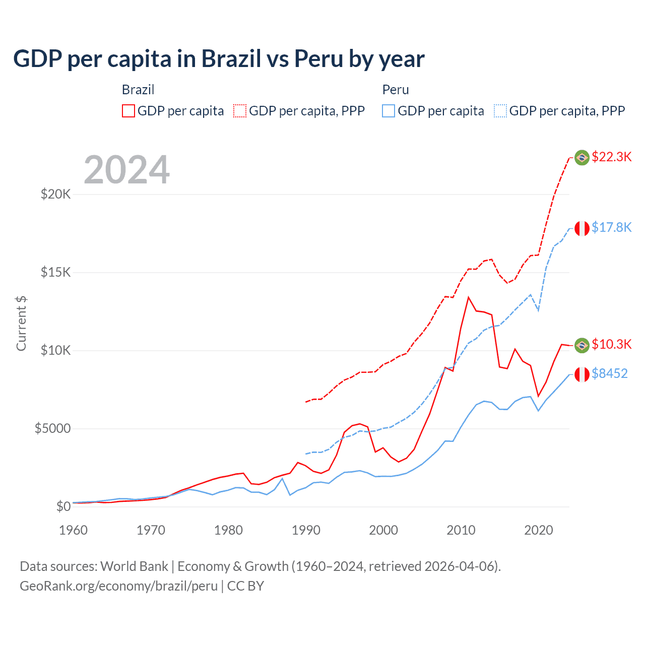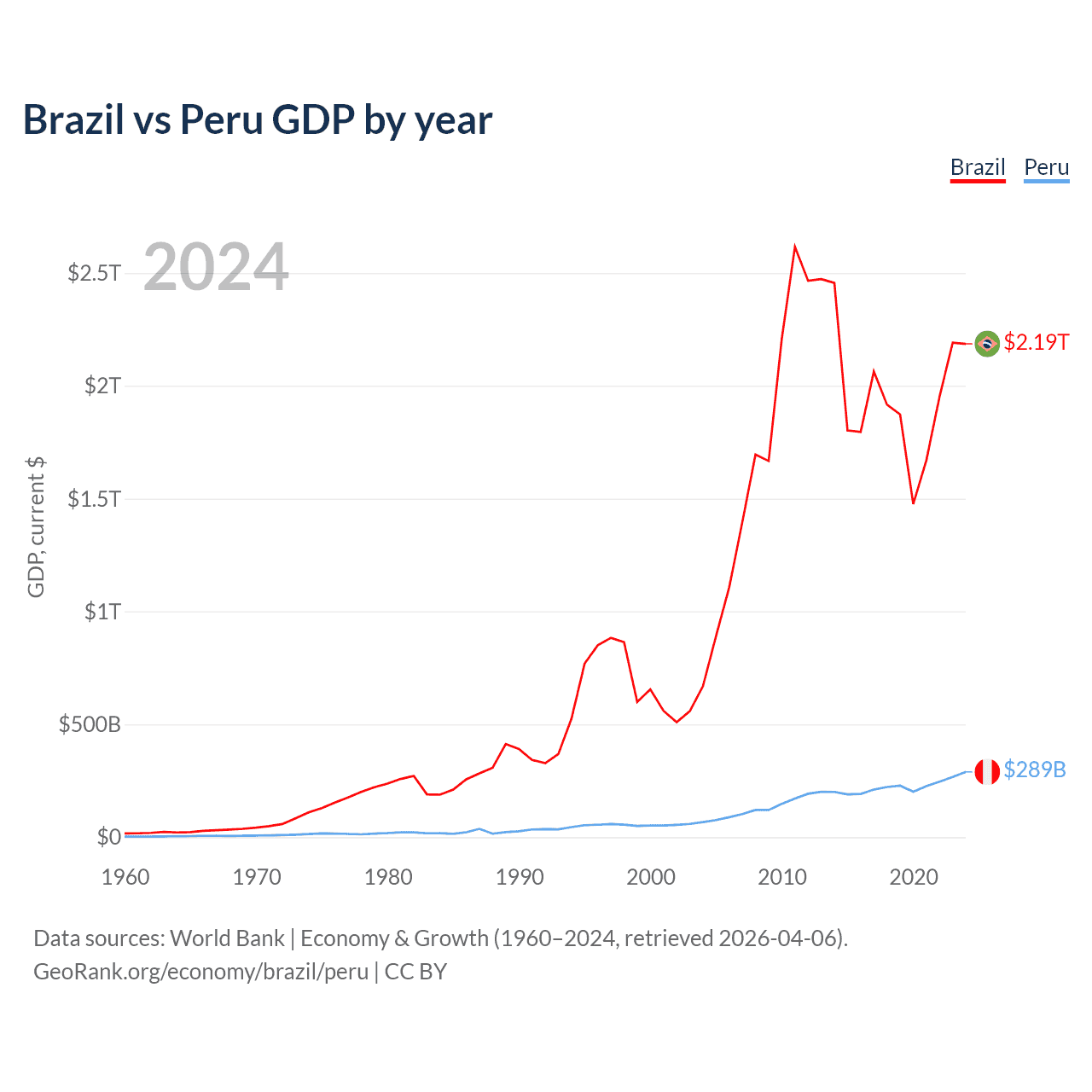 Brazil has a GDP of $2.19T compared to $289B for Peru, ranking 10/197 and 49/197 by economy size, respectively.
