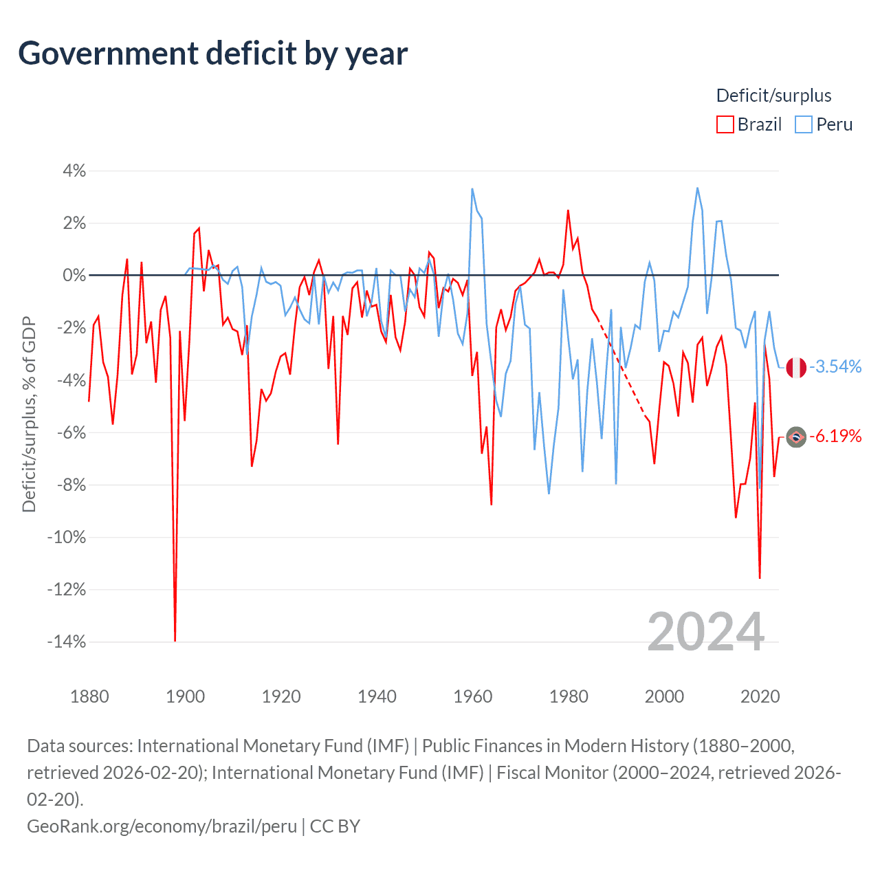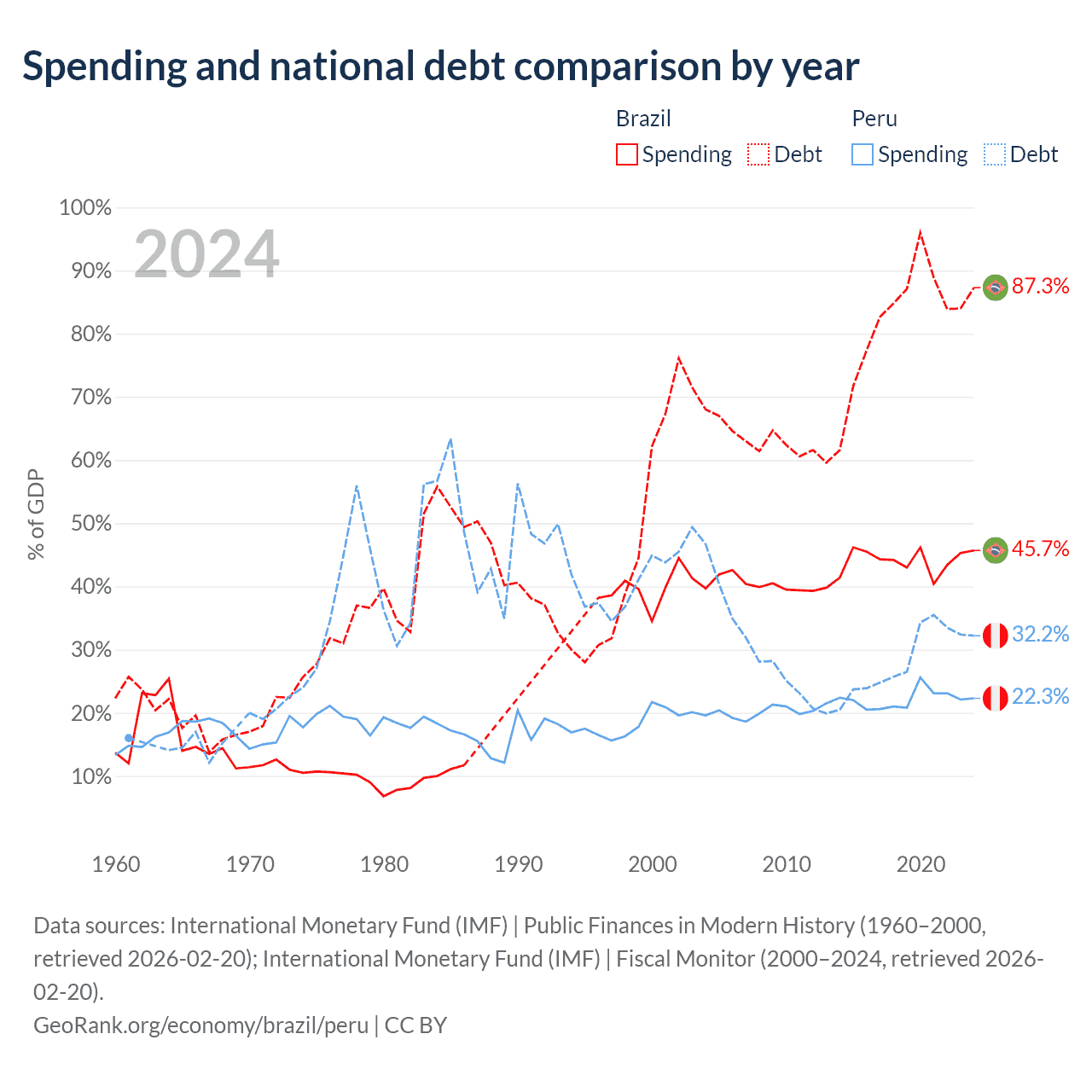 Brazil has $1.91T in government debt (87.3% of GDP), compared to $93B (32.2% of GDP) in Peru.