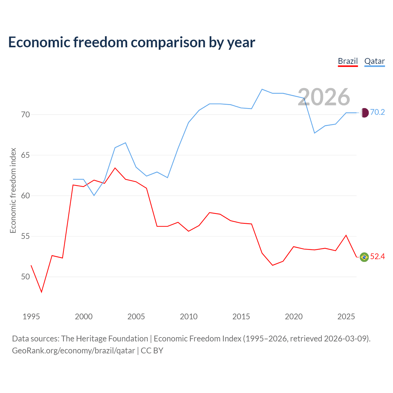 The Economic Freedom Index for Brazil is 52.4, ranking 148/197, compared to 70.2 for Qatar, ranking 37/197. The chart above displays a comparison of annual changes in economic freedom indexes.