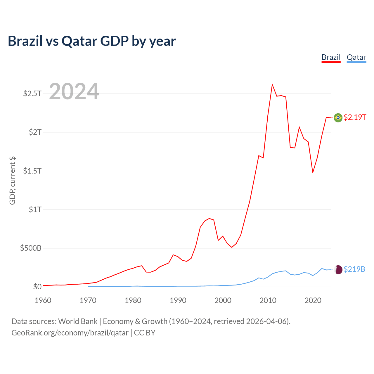 Brazil vs Qatar GDP by year
