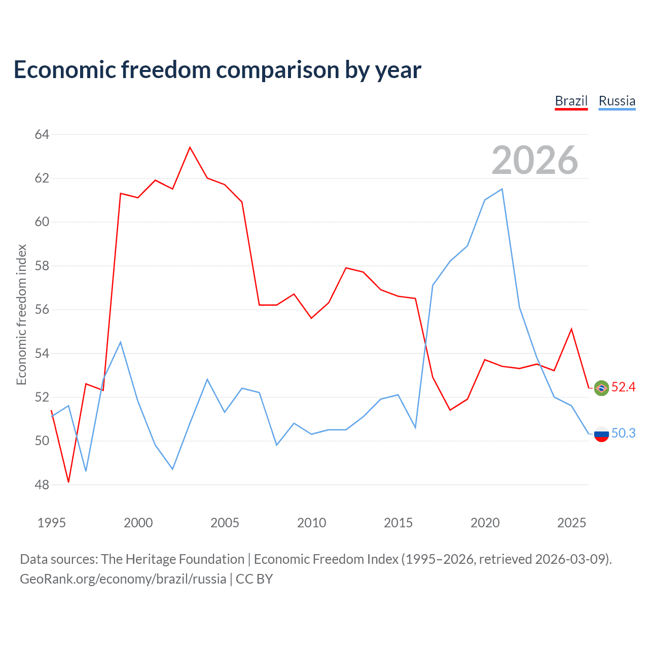 The Economic Freedom Index for Brazil is 52.4, ranking 148/197, compared to 50.3 for Russia, ranking 161/197. The chart above displays a comparison of annual changes in economic freedom indexes.