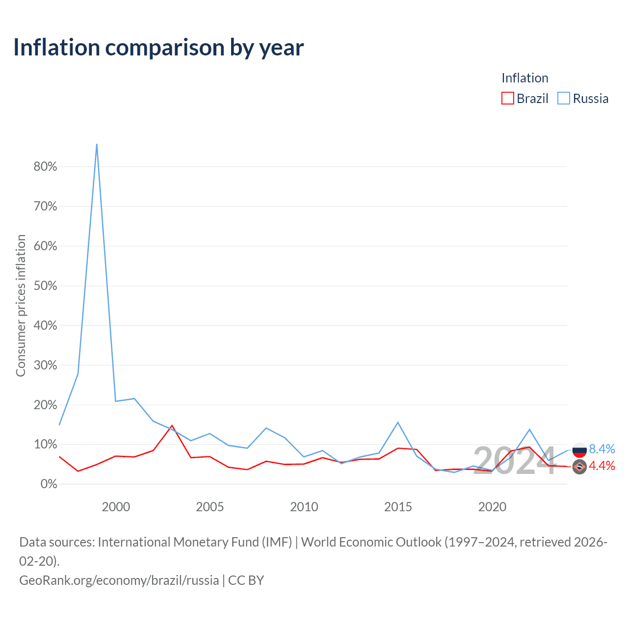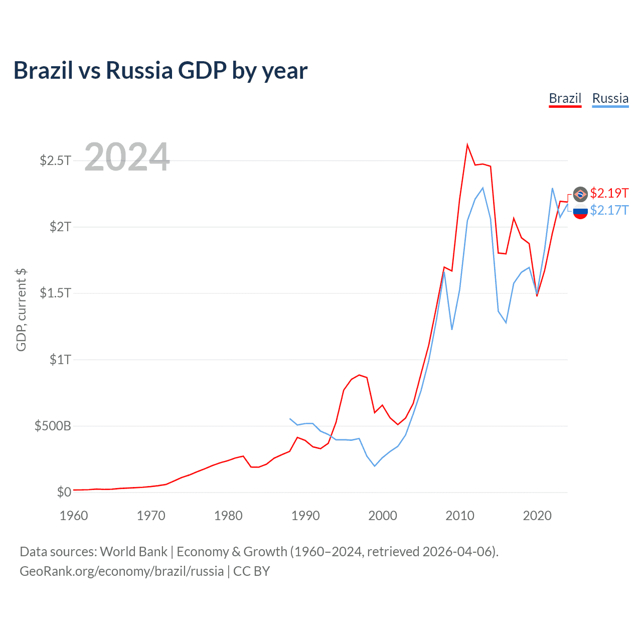 Brazil has a GDP of $2.19T compared to $2.17T for Russia, ranking 10/197 and 11/197 by economy size, respectively.