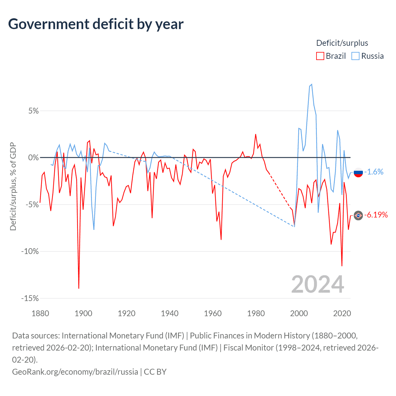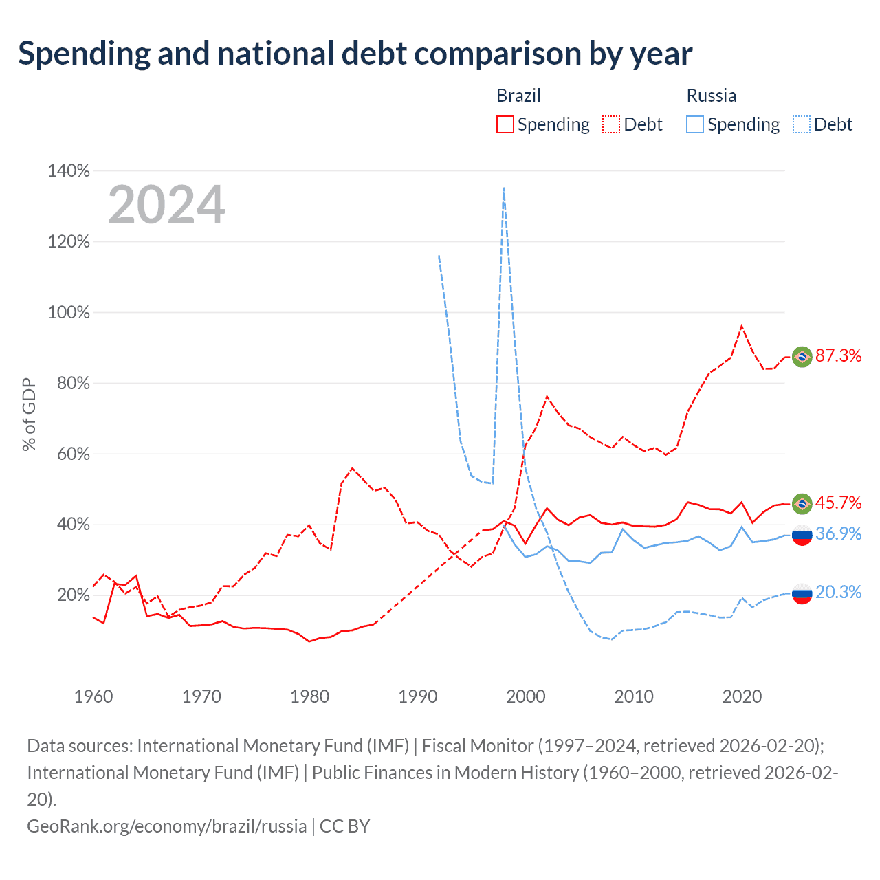 Brazil has $1.91T in government debt (87.3% of GDP), compared to $440B (20.3% of GDP) in Russia.