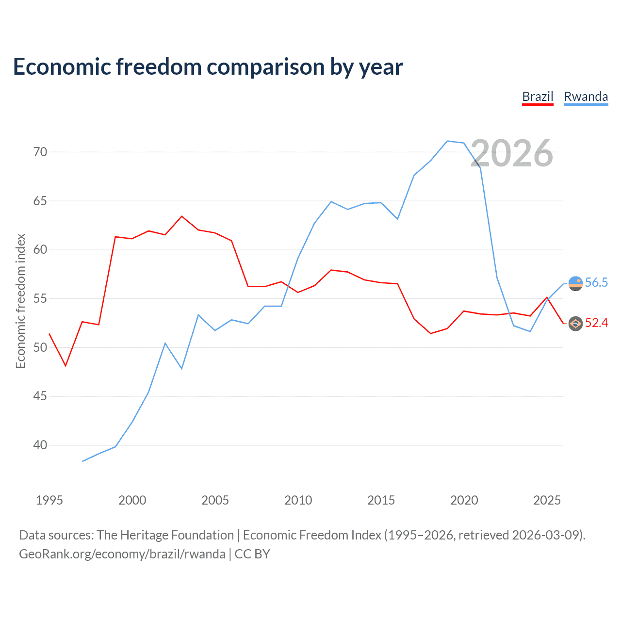 The Economic Freedom Index for Brazil is 52.4, ranking 148/197, compared to 56.5 for Rwanda, ranking 121/197. The chart above displays a comparison of annual changes in economic freedom indexes.