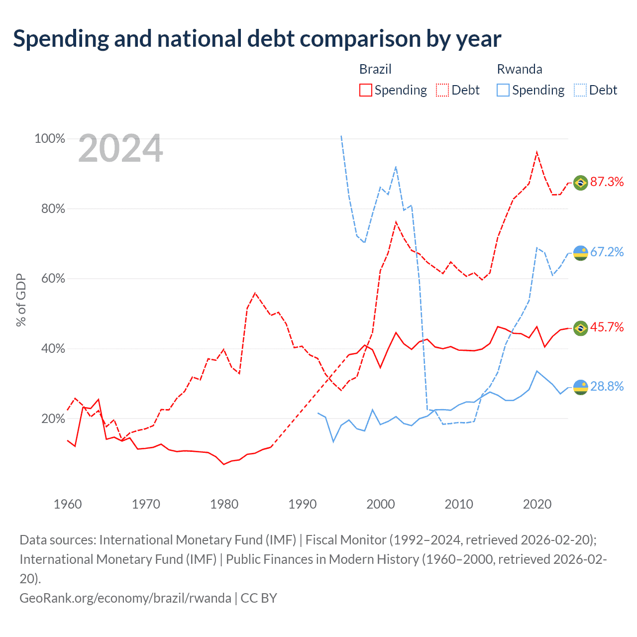 Brazil has $1.91T in government debt (87.3% of GDP), compared to $9.58B (67.2% of GDP) in Rwanda.