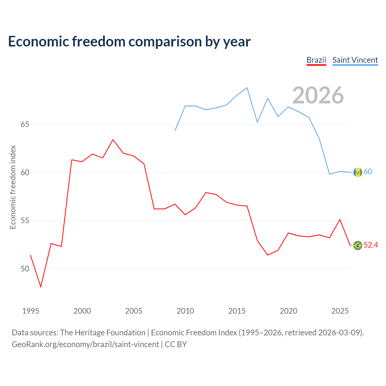 The Economic Freedom Index for Brazil is 52.4, ranking 148/197, compared to 60 for Saint Vincent, ranking 98/197. The chart above displays a comparison of annual changes in economic freedom indexes.