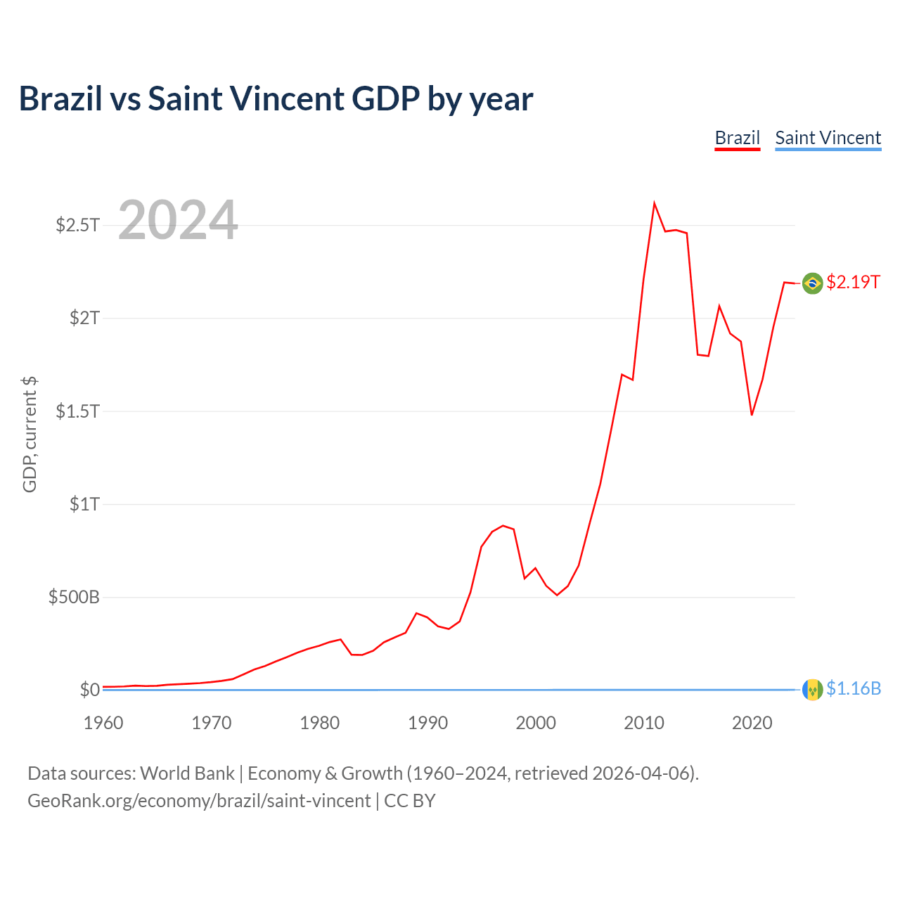Brazil has a GDP of $2.19T compared to $1.16B for Saint Vincent, ranking 10/197 and 186/197 by economy size, respectively.