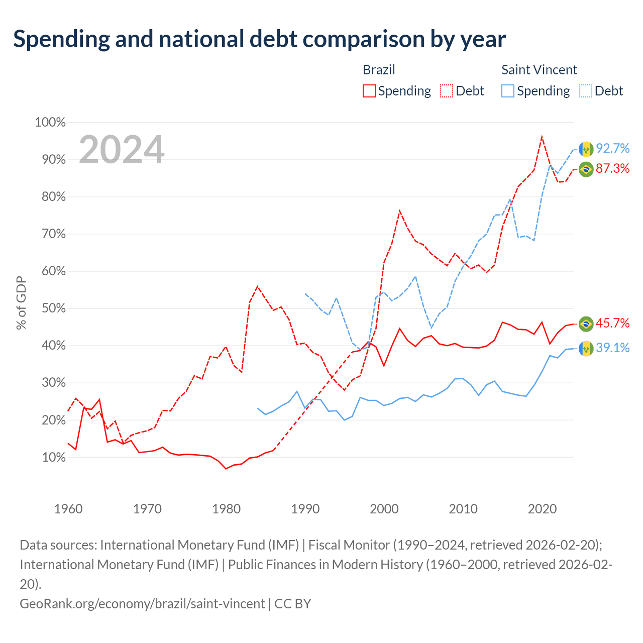 Brazil has $1.91T in government debt (87.3% of GDP), compared to $1.07B (92.7% of GDP) in Saint Vincent.