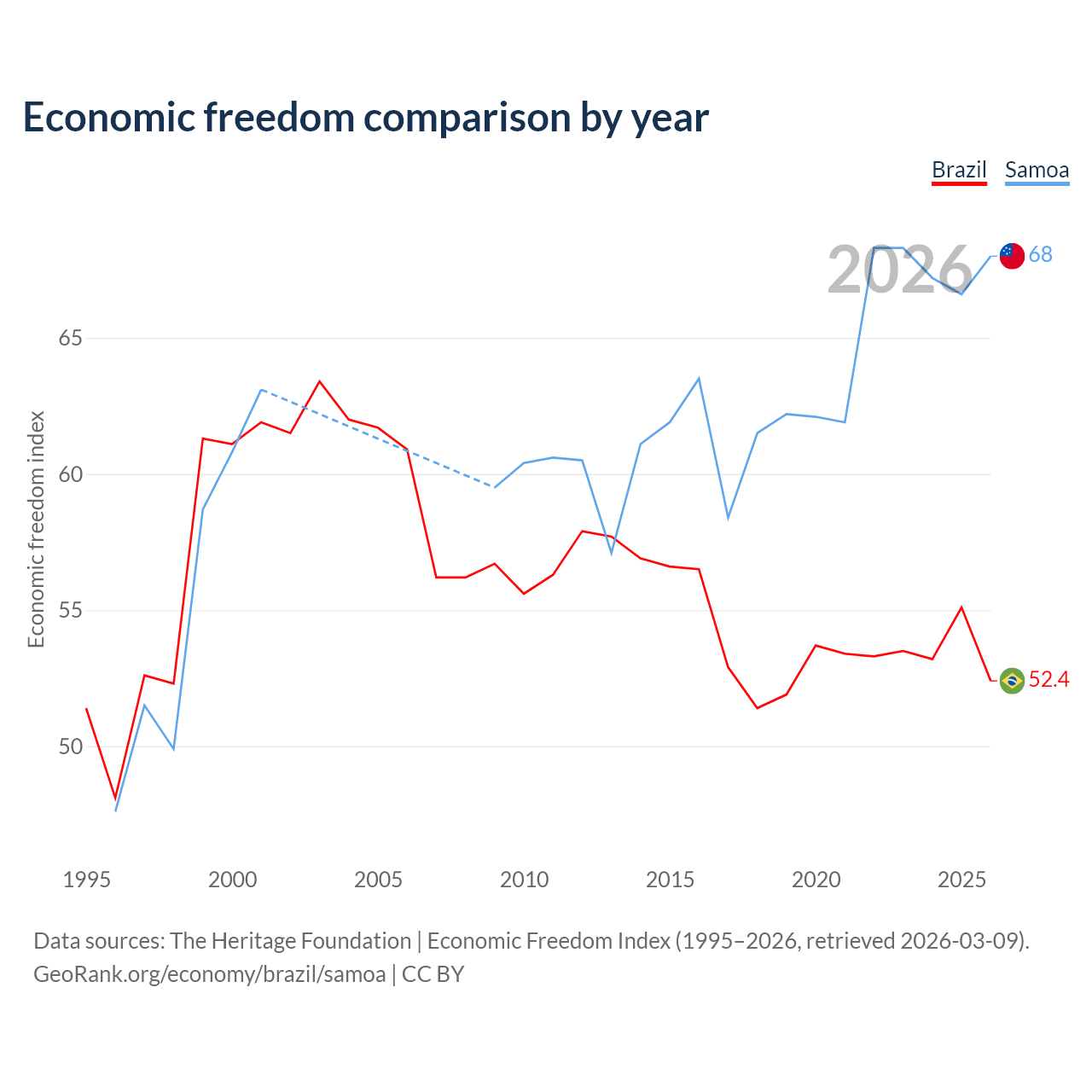 The Economic Freedom Index for Brazil is 52.4, ranking 148/197, compared to 68 for Samoa, ranking 52/197. The chart above displays a comparison of annual changes in economic freedom indexes.