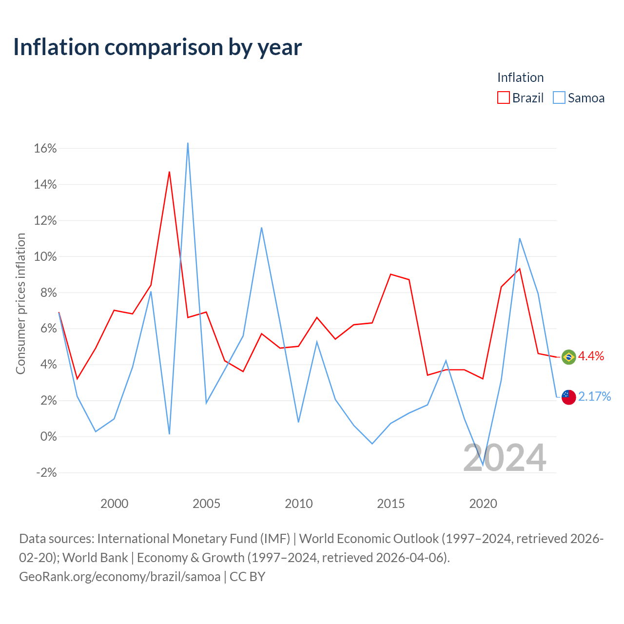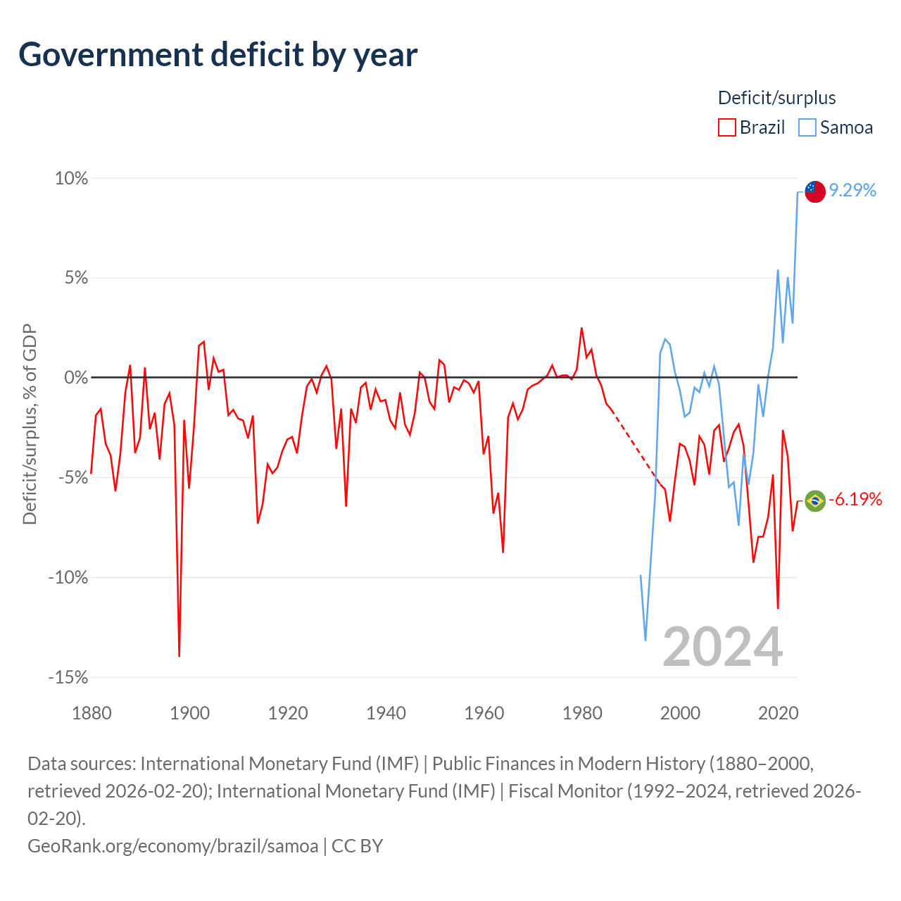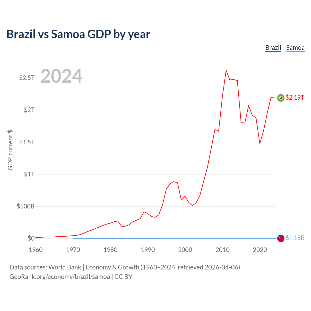 Brazil has a GDP of $2.19T compared to $1.18B for Samoa, ranking 10/197 and 185/197 by economy size, respectively.