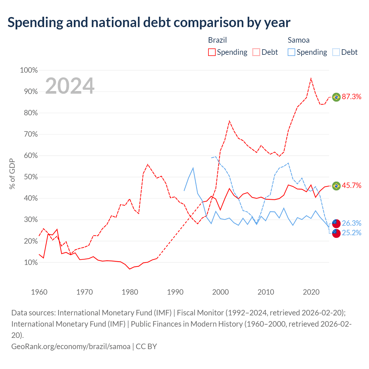 Brazil has $1.91T in government debt (87.3% of GDP), compared to $296M (25.2% of GDP) in Samoa.