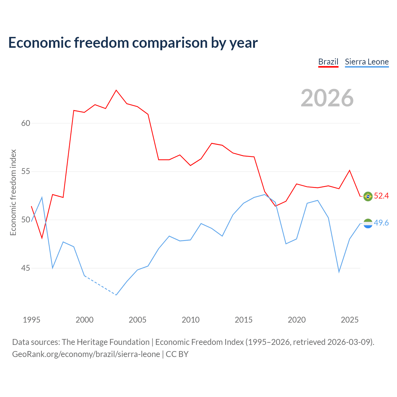 The Economic Freedom Index for Brazil is 52.4, ranking 148/197, compared to 49.6 for Sierra Leone, ranking 165/197. The chart above displays a comparison of annual changes in economic freedom indexes.