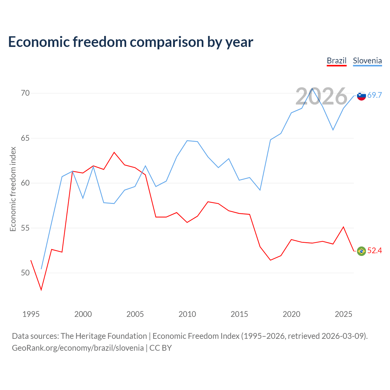 The Economic Freedom Index for Brazil is 52.4, ranking 148/197, compared to 69.7 for Slovenia, ranking 40/197. The chart above displays a comparison of annual changes in economic freedom indexes.