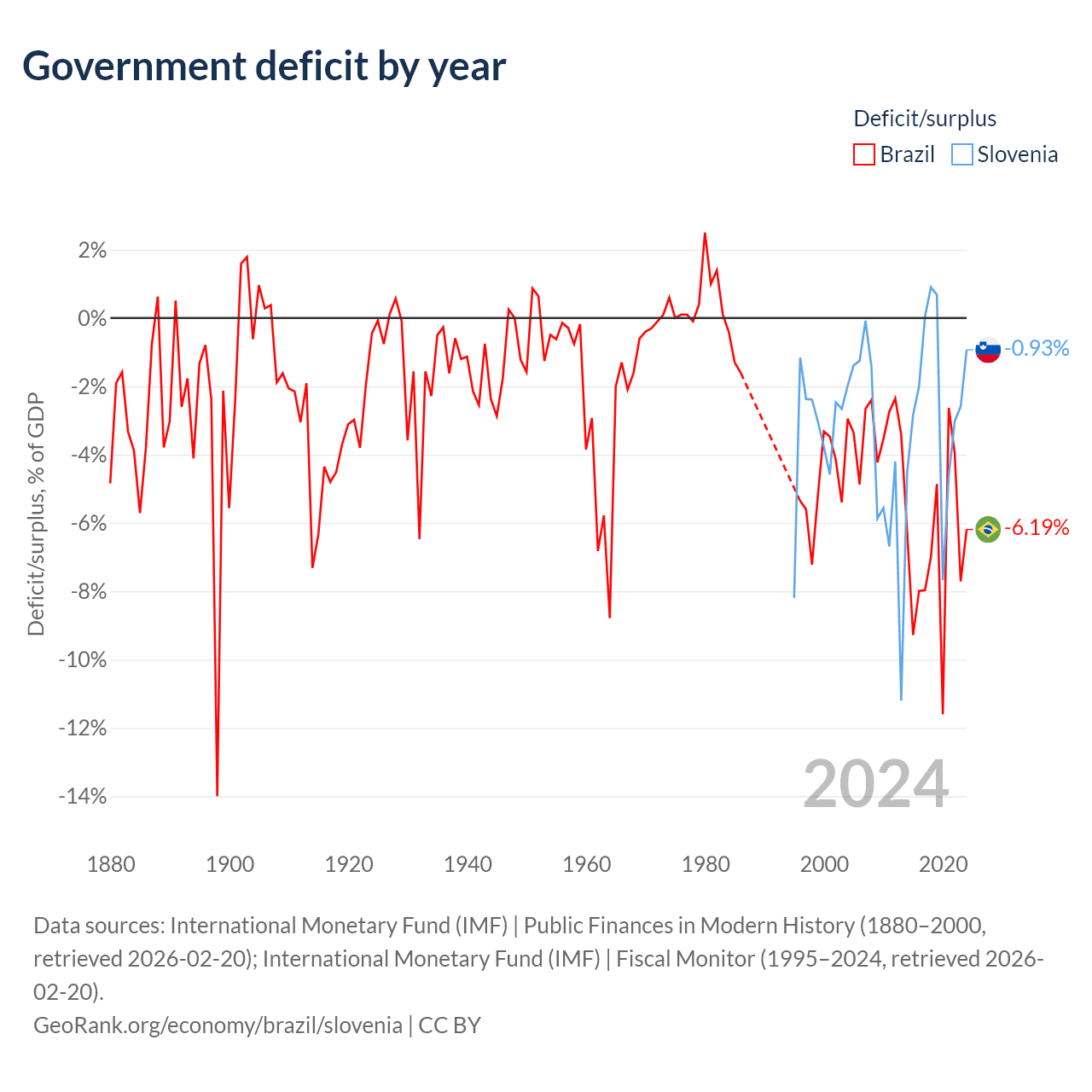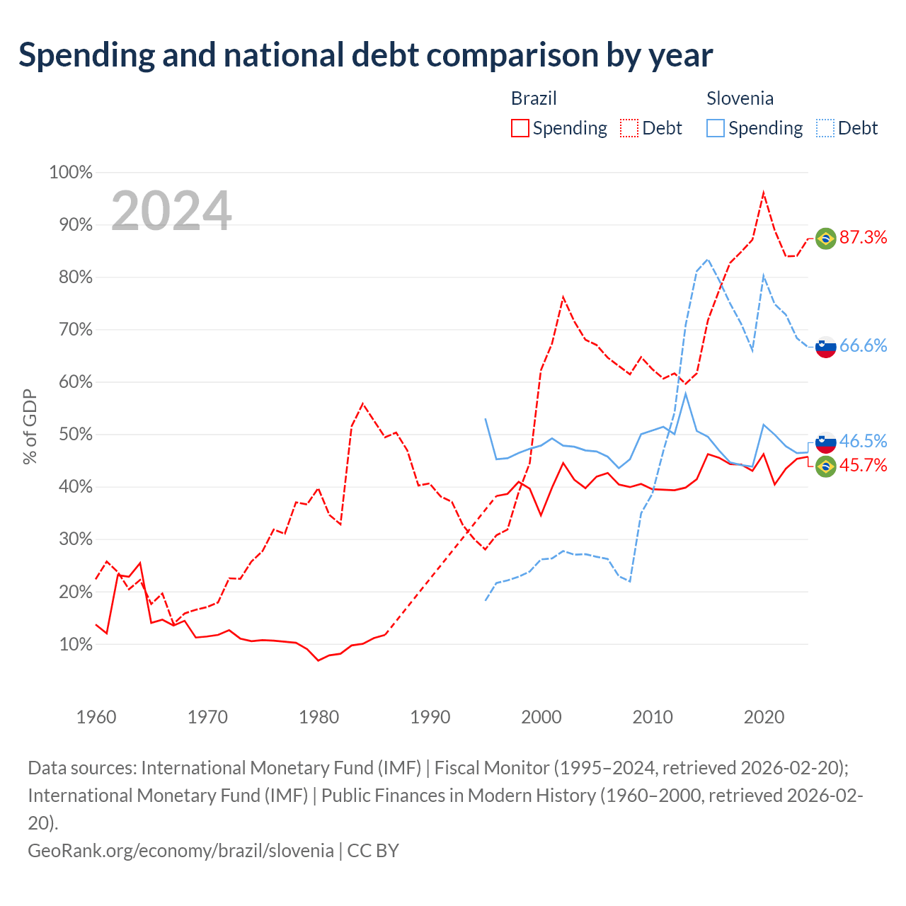 Brazil has $1.91T in government debt (87.3% of GDP), compared to $48.6B (66.6% of GDP) in Slovenia.
