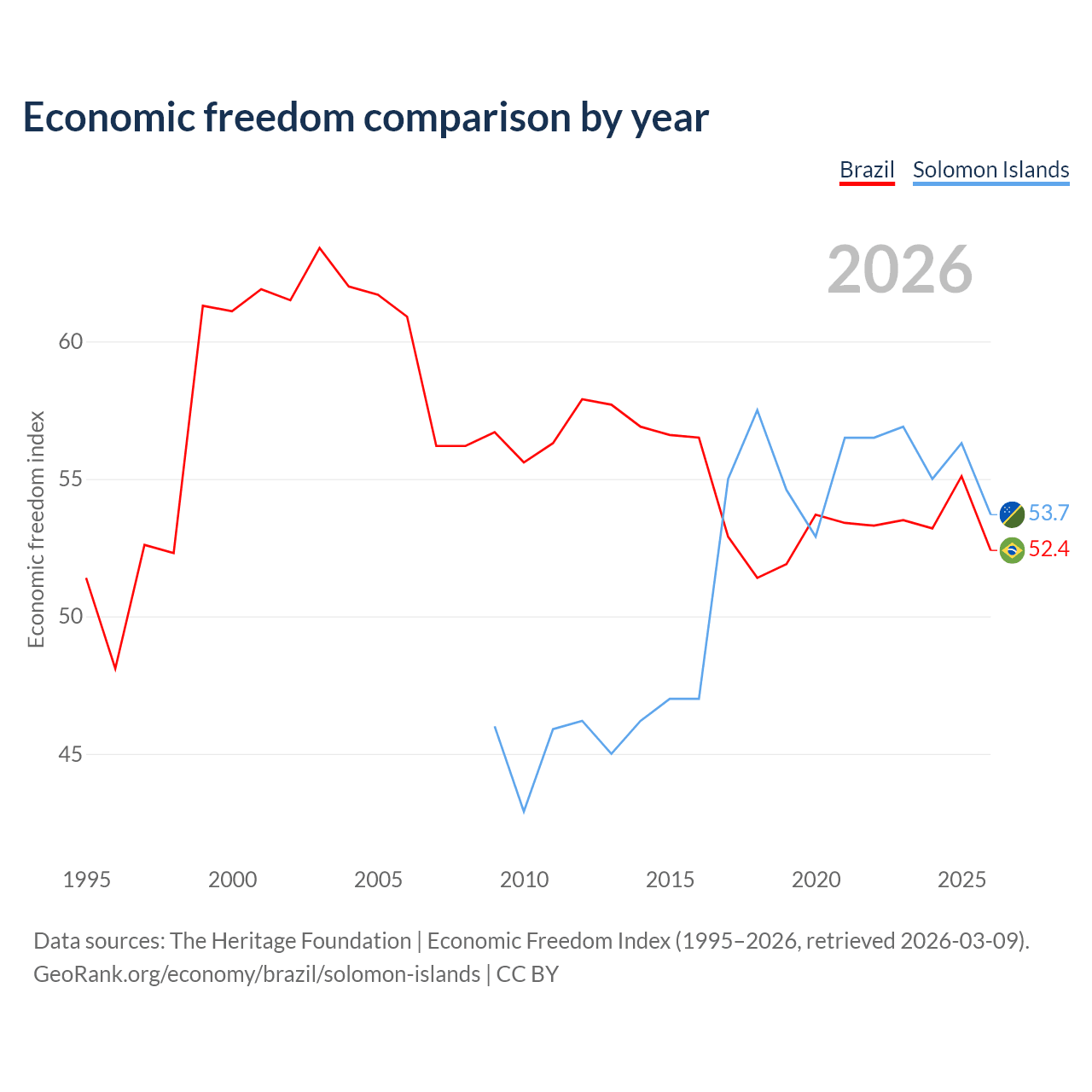 The Economic Freedom Index for Brazil is 52.4, ranking 148/197, compared to 53.7 for the Solomon Islands, ranking 137/197. The chart above displays a comparison of annual changes in economic freedom indexes.