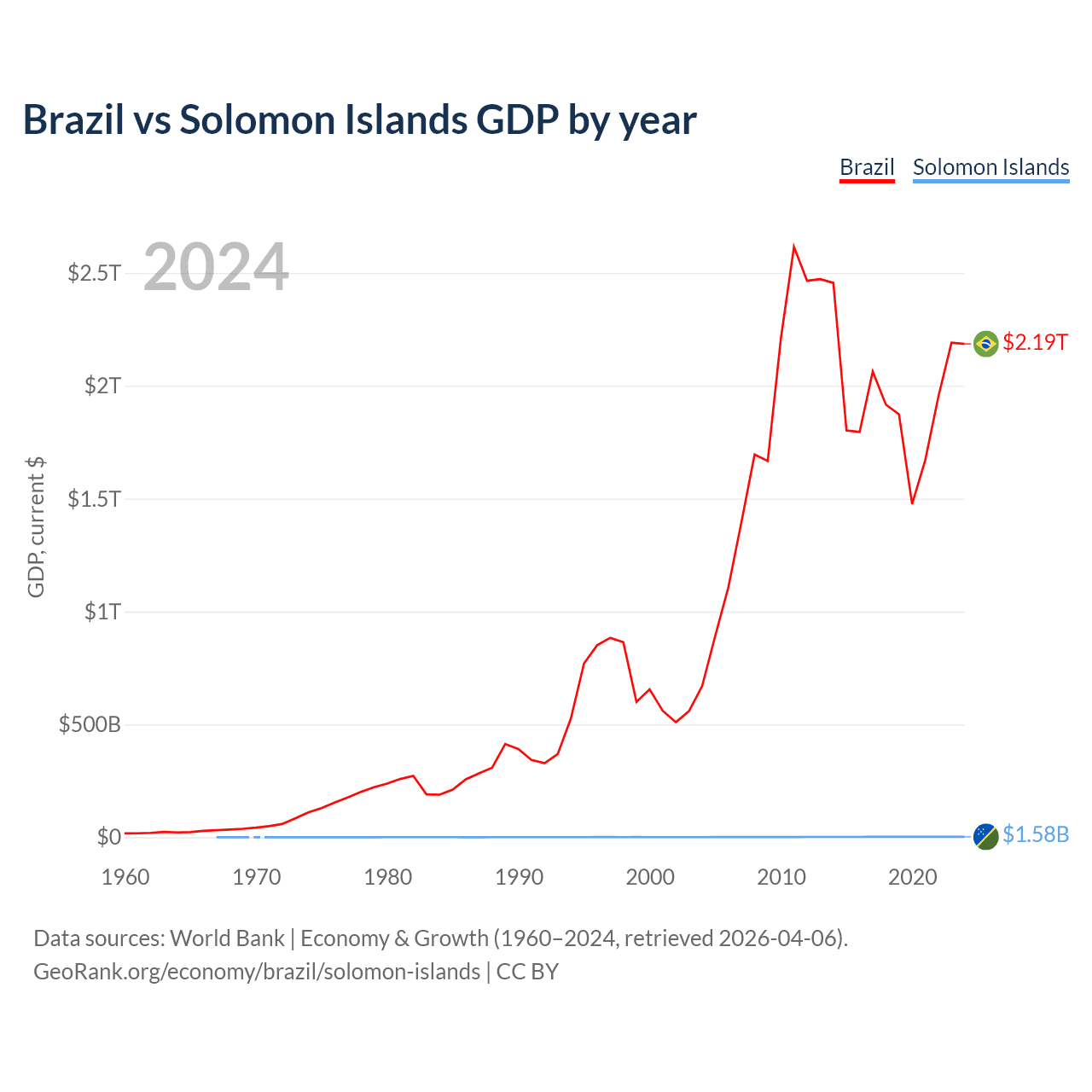 Brazil has a GDP of $2.19T compared to $1.58B for the Solomon Islands, ranking 10/197 and 182/197 by economy size, respectively.