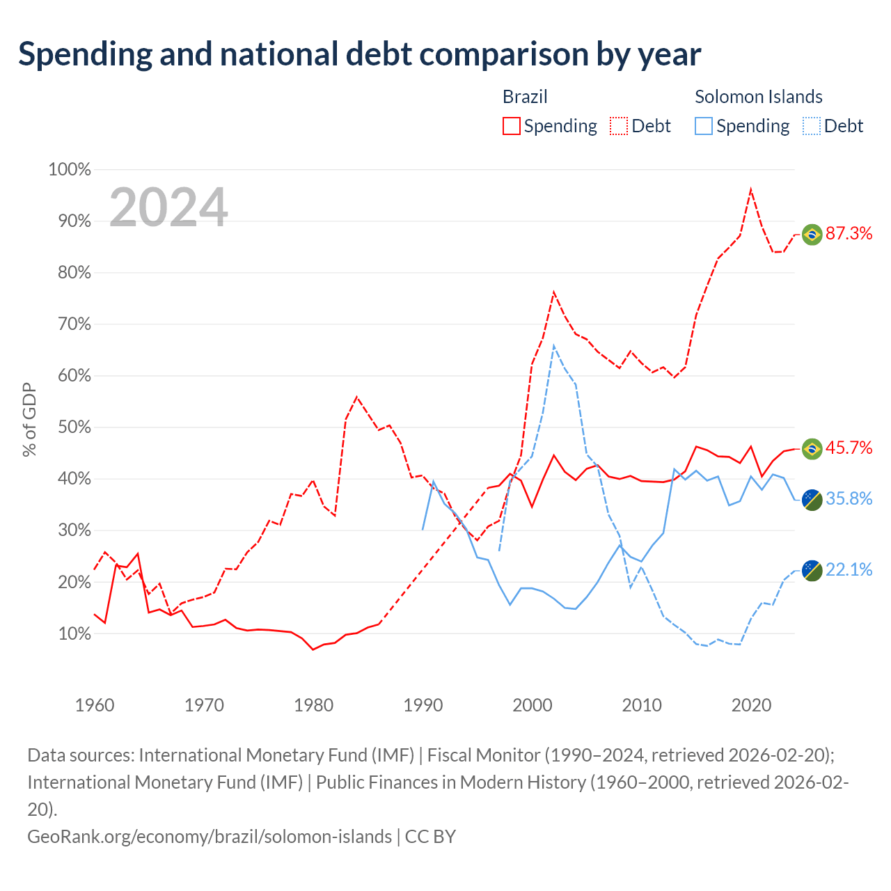 Brazil has $1.91T in government debt (87.3% of GDP), compared to $350M (22.1% of GDP) in the Solomon Islands.
