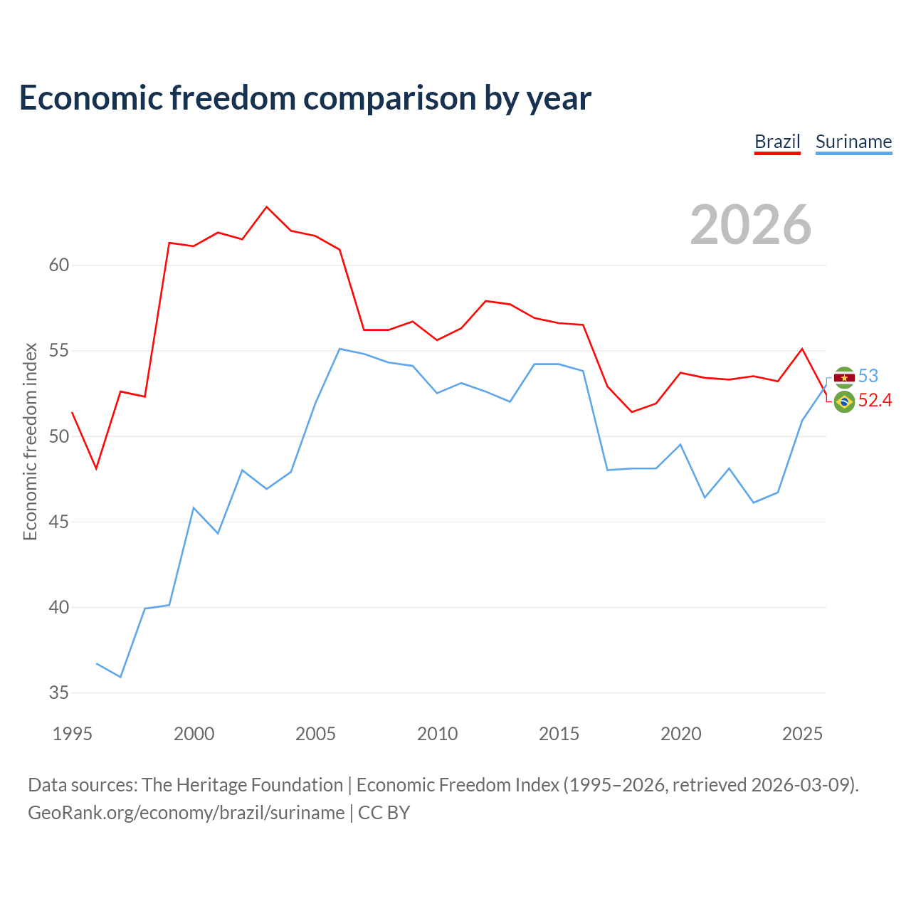 The Economic Freedom Index for Brazil is 52.4, ranking 148/197, compared to 53 for Suriname, ranking 143/197. The chart above displays a comparison of annual changes in economic freedom indexes.