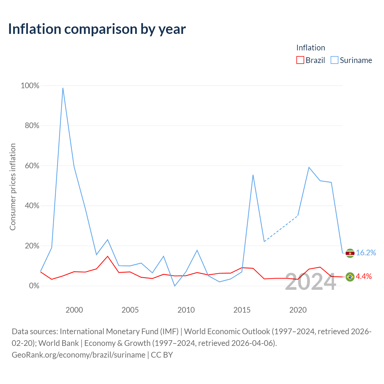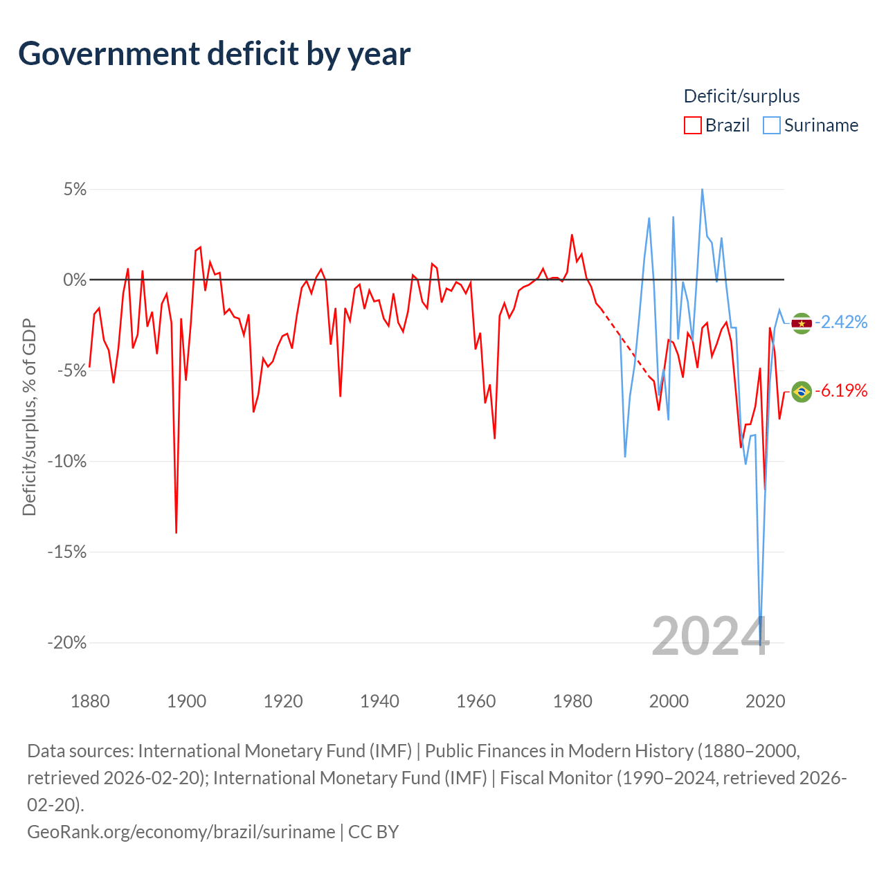 Brazil has a GDP of $2.19T compared to $4.42B for Suriname, ranking 10/197 and 164/197 by economy size, respectively.