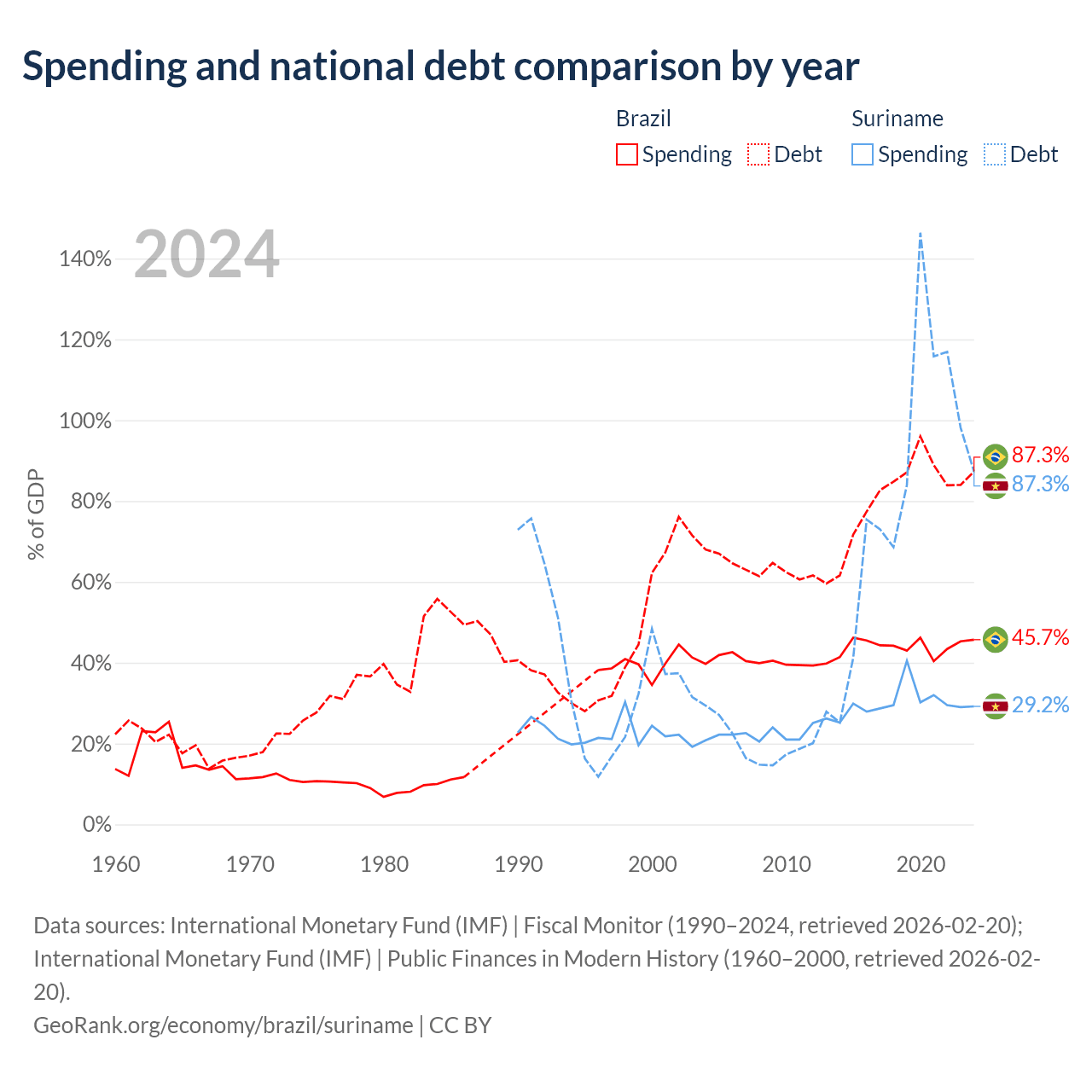 Brazil has $1.91T in government debt (87.3% of GDP), compared to $3.86B (87.3% of GDP) in Suriname.