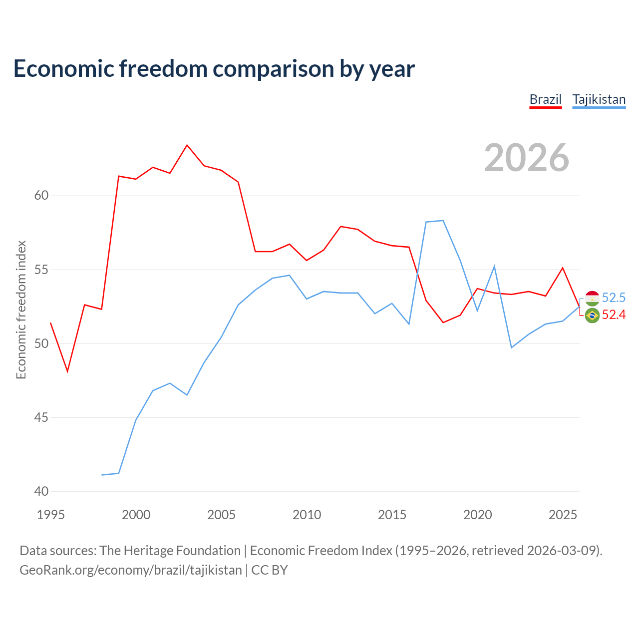 The Economic Freedom Index for Brazil is 52.4, ranking 148/197, compared to 52.5 for Tajikistan, ranking 147/197. The chart above displays a comparison of annual changes in economic freedom indexes.