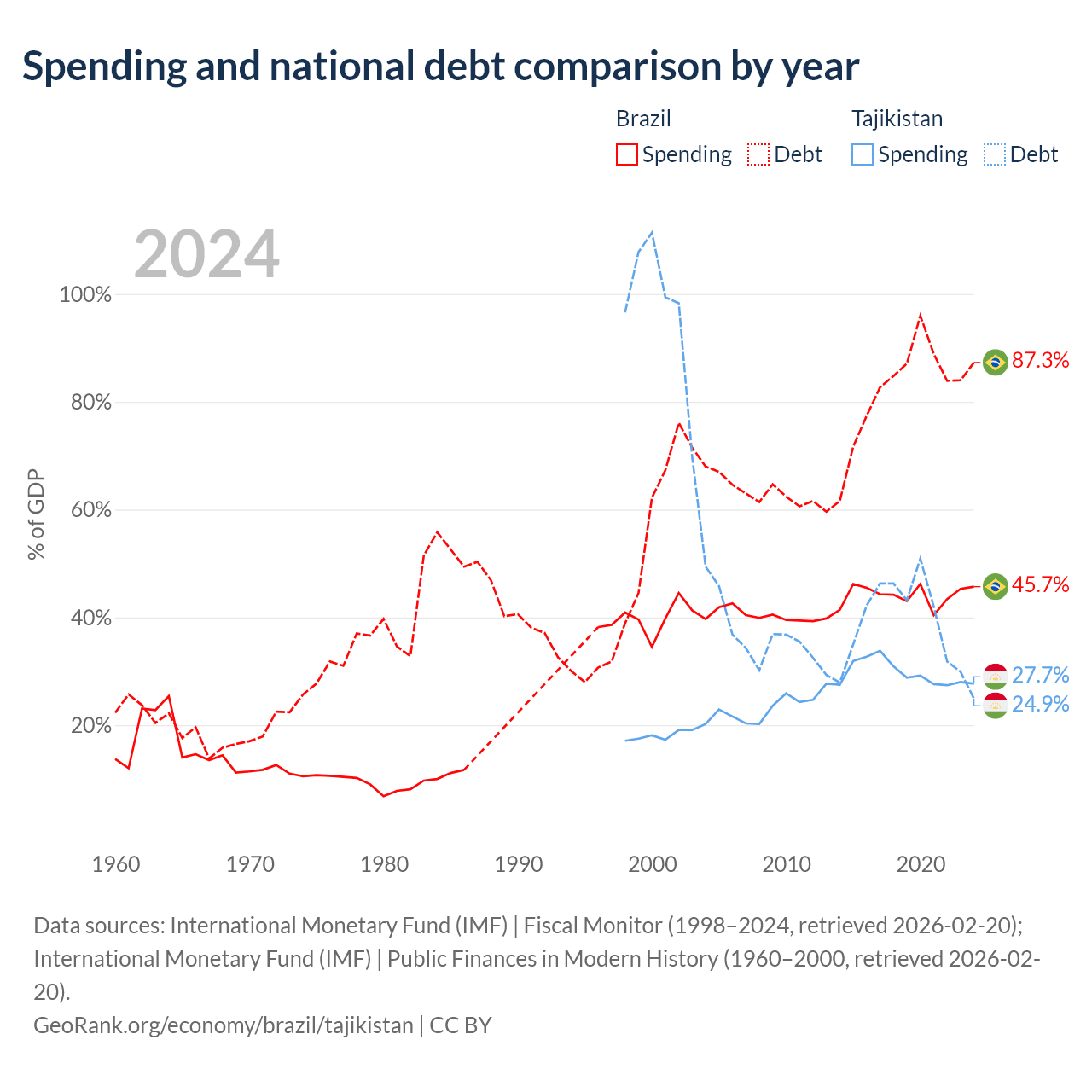 Brazil has $1.91T in government debt (87.3% of GDP), compared to $3.54B (24.9% of GDP) in Tajikistan.