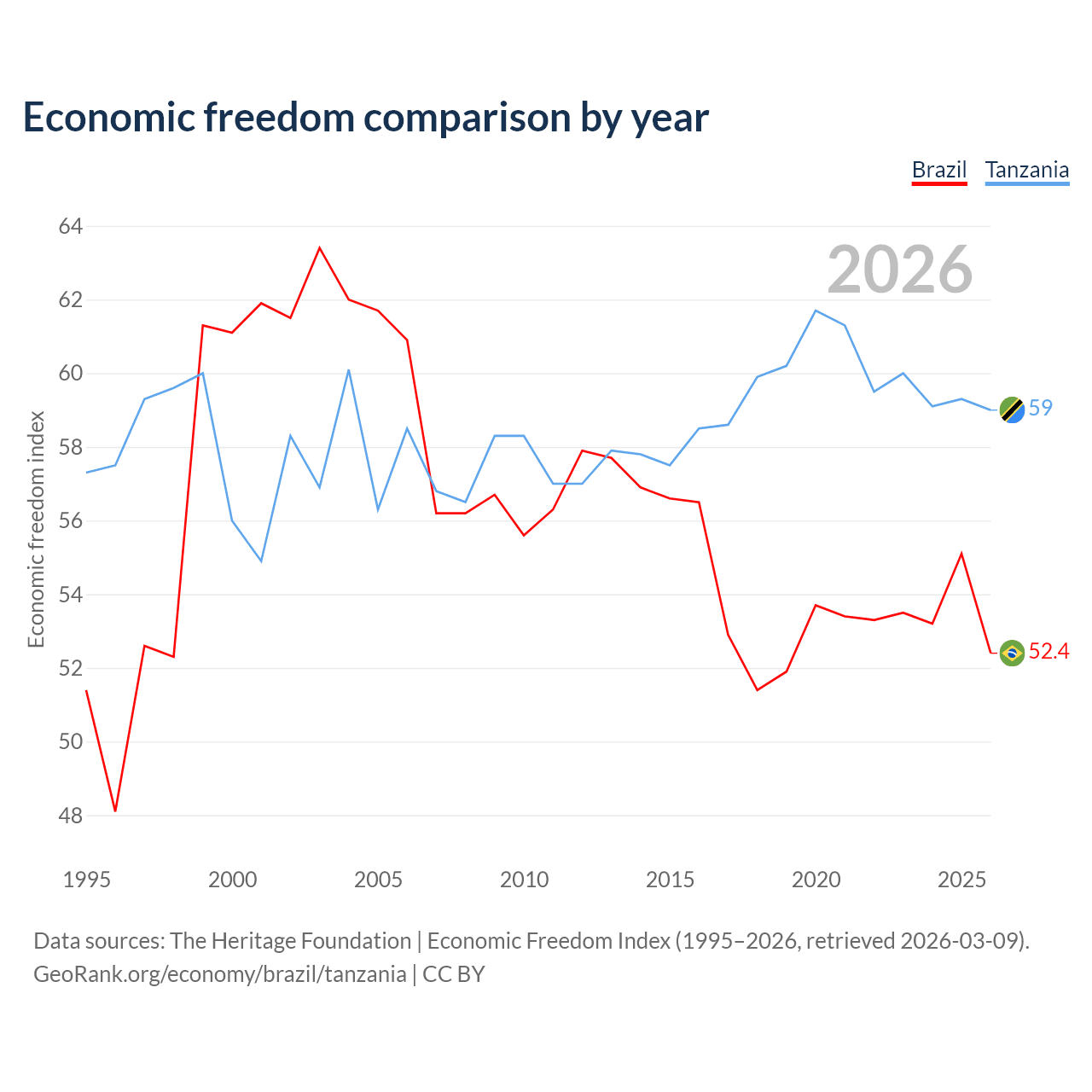 The Economic Freedom Index for Brazil is 52.4, ranking 148/197, compared to 59 for Tanzania, ranking 106/197. The chart above displays a comparison of annual changes in economic freedom indexes.